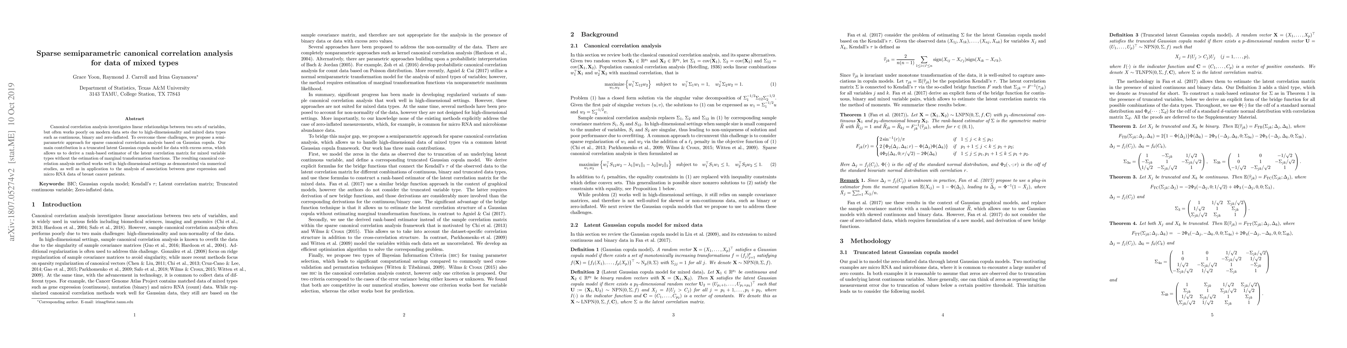 Canonical correlation analysis investigates linear relationships between two sets of variables, but often works poorly on modern data sets due to high-dimensionality and mixed data types such as continuous, binary and zero-inflated. To overcome these challenges, we propose a semiparametric approach for sparse canonical correlation analysis based on Gaussian copula. Our main contribution is a truncated latent Gaussian copula model for data with excess zeros, which allows us to derive a rank-based estimator of the latent correlation matrix for mixed variable types without the estimation of marginal transformation functions. The resulting canonical correlation analysis method works well in high-dimensional settings as demonstrated via numerical studies, as well as in application to the analysis of association between gene expression and micro RNA data of breast cancer patients.