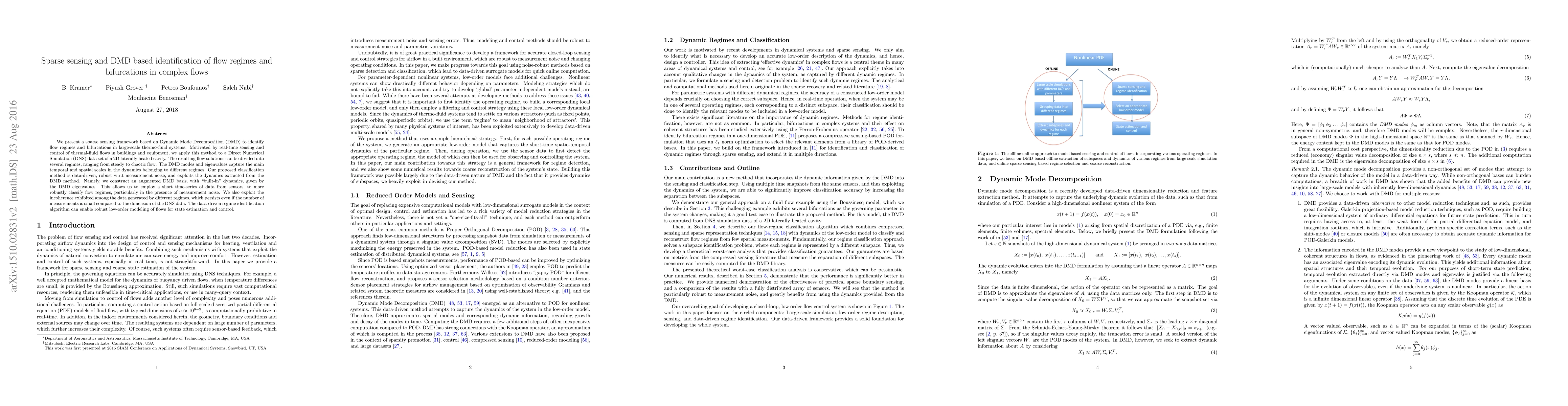 We present a sparse sensing framework based on Dynamic Mode Decomposition (DMD) to identify flow regimes and bifurcations in large-scale thermo-fluid systems. Motivated by real-time sensing and control of thermal-fluid flows in buildings and equipment, we apply this method to a Direct Numerical Simulation (DNS) data set of a 2D laterally heated cavity. The resulting flow solutions can be divided into several regimes, ranging from steady to chaotic flow. The DMD modes and eigenvalues capture the main temporal and spatial scales in the dynamics belonging to different regimes. Our proposed classification method is data-driven, robust w.r.t measurement noise, and exploits the dynamics extracted from the DMD method. Namely, we construct an augmented DMD basis, with "built-in" dynamics, given by the DMD eigenvalues. This allows us to employ a short time-series of data from sensors, to more robustly classify flow regimes, particularly in the presence of measurement noise. We also exploit the incoherence exhibited among the data generated by different regimes, which persists even if the number of measurements is small compared to the dimension of the DNS data. The data-driven regime identification algorithm can enable robust low-order modeling of flows for state estimation and control.