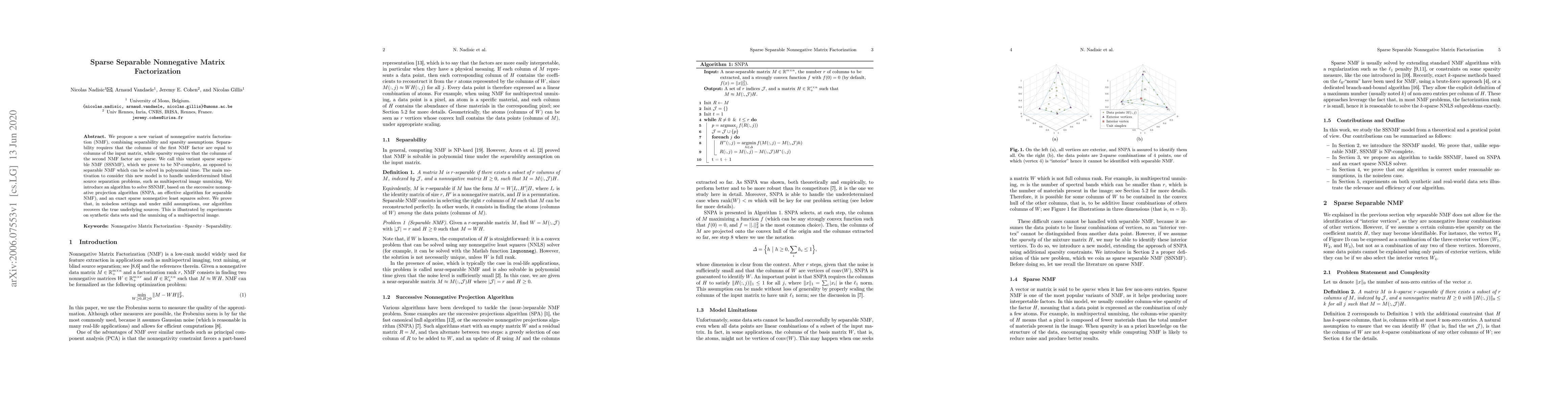 We propose a new variant of nonnegative matrix factorization (NMF), combining separability and sparsity assumptions. Separability requires that the columns of the first NMF factor are equal to columns of the input matrix, while sparsity requires that the columns of the second NMF factor are sparse. We call this variant sparse separable NMF (SSNMF), which we prove to be NP-complete, as opposed to separable NMF which can be solved in polynomial time. The main motivation to consider this new model is to handle underdetermined blind source separation problems, such as multispectral image unmixing. We introduce an algorithm to solve SSNMF, based on the successive nonnegative projection algorithm (SNPA, an effective algorithm for separable NMF), and an exact sparse nonnegative least squares solver. We prove that, in noiseless settings and under mild assumptions, our algorithm recovers the true underlying sources. This is illustrated by experiments on synthetic data sets and the unmixing of a multispectral image.