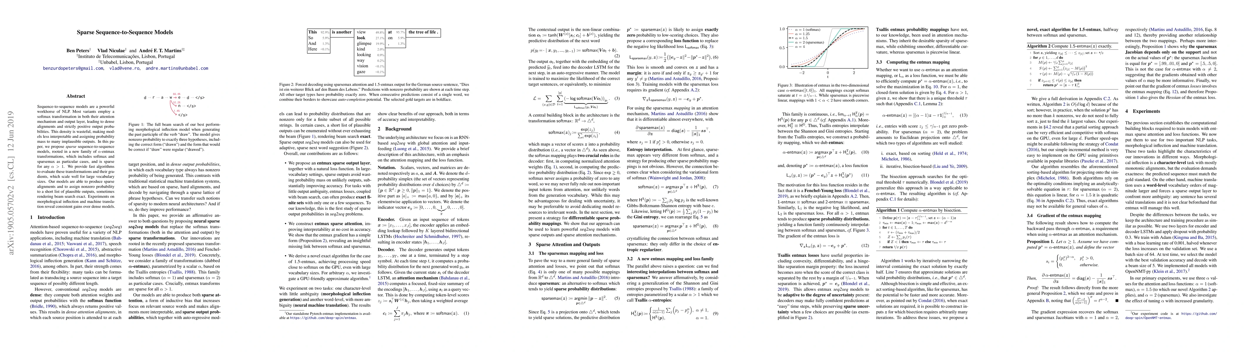 This paper proposes sparse sequence-to-sequence models using $\alpha$-entmax transformations to replace dense softmax layers, resulting in sparse outputs that improve interpretability and efficiency in NLP tasks. Experiments show consistent gains over traditional dense models in morphological inflection and machine translation.