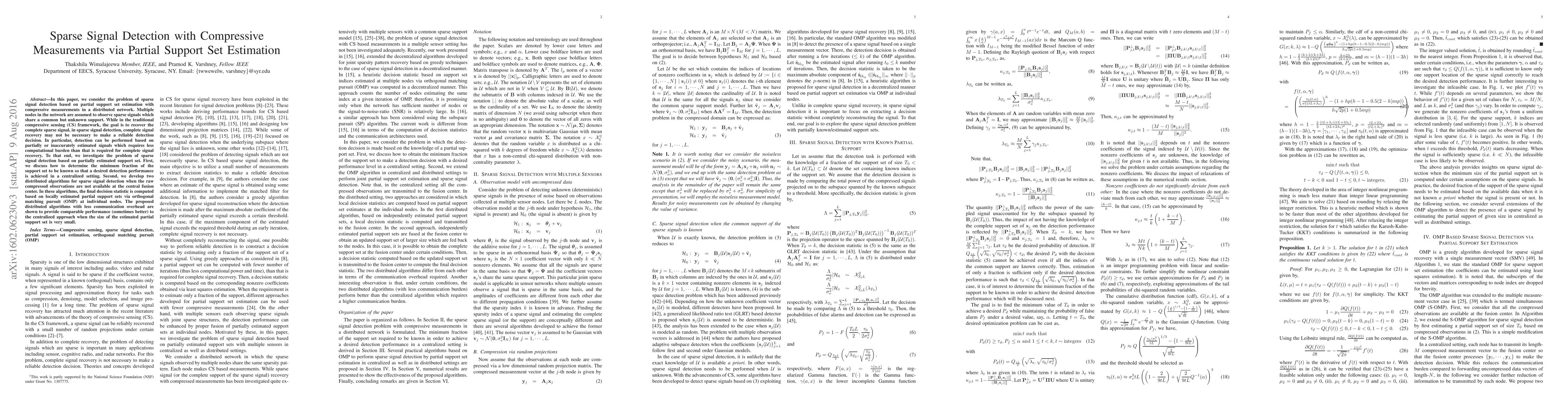 This paper explores sparse signal detection in distributed networks using compressive measurements and partial support set estimation. It proposes distributed algorithms that achieve reliable detection with less computational burden compared to traditional complete signal recovery, demonstrating comparable performance to centralized approaches when using small partial support sets.