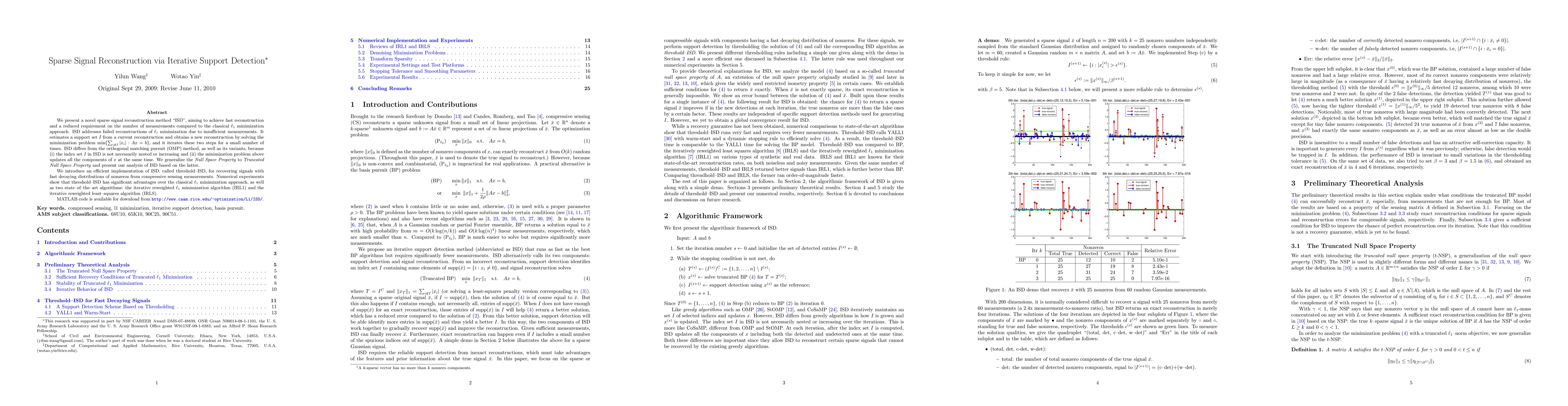 This paper introduces a novel sparse signal reconstruction method called ISD, which aims to achieve faster reconstruction and fewer measurements compared to l_1 minimization. ISD iteratively detects support sets and updates reconstructions, differing from OMP by allowing non-nested index sets and simultaneous updates. Numerical experiments show ISD, especially its efficient implementation threshold-ISD, outperforms l_1 minimization and other state-of-the-art algorithms.