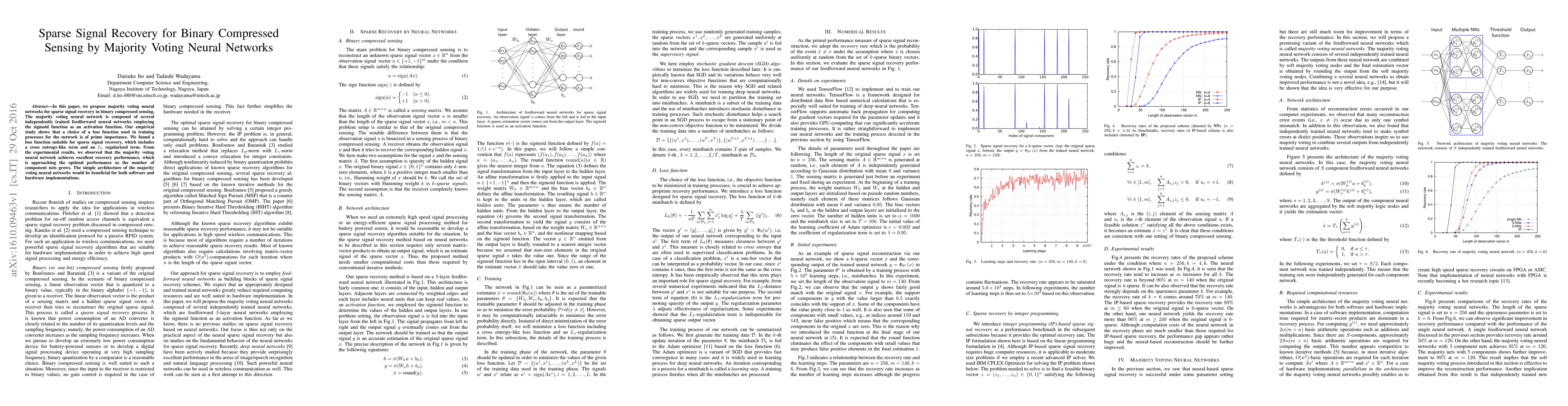 This paper proposes majority voting neural networks for sparse signal recovery in binary compressed sensing, demonstrating that a loss function combining cross entropy and $L_1$ regularization yields optimal performance. The architecture achieves near-optimal recovery results, with performance improving as the number of component networks increases.