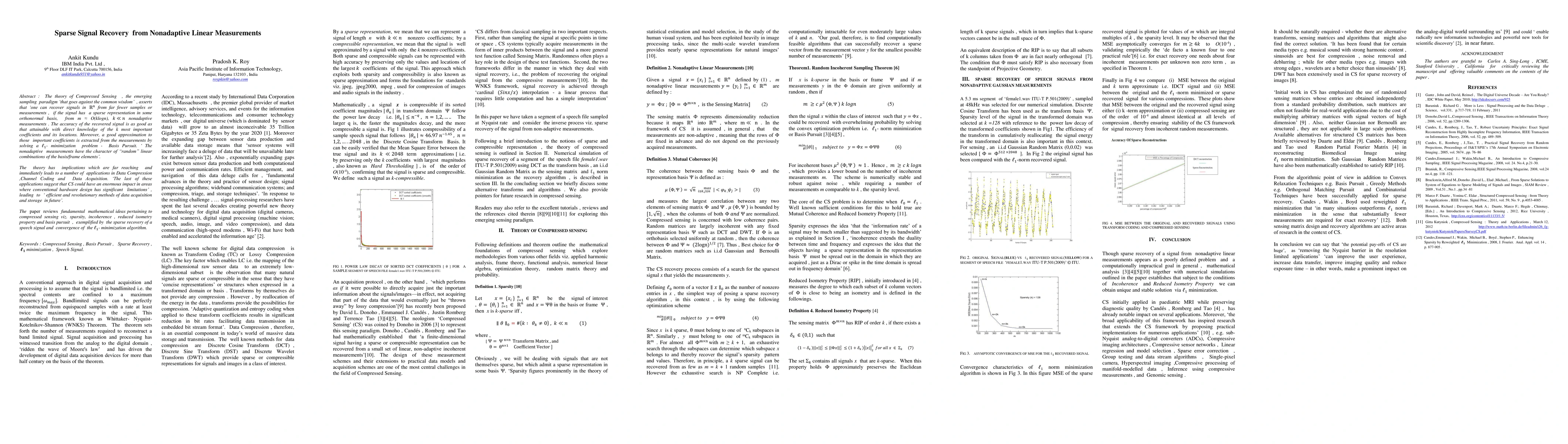 The theory of Compressed Sensing, the emerging sampling paradigm 'that goes against the common wisdom', asserts that 'one can recover signals in Rn from far fewer samples or measurements, if the signal has a sparse representation in some orthonormal basis', from m = O(klogn), k<< n nonadaptive measurements . The accuracy of the recovered signal is 'as good as that attainable with direct knowledge of the k most important coefficients and its locations'. Moreover, a good approximation to those important coefficients is extracted from the measurements by solving a L1 minimization problem viz. Basis Pursuit. 'The nonadaptive measurements have the character of random linear combinations of the basis/frame elements'. The theory has implications which are far reaching and immediately leads to a number of applications in Data Compression,Channel Coding and Data Acquisition. 'The last of these applications suggest that CS could have an enormous impact in areas where conventional hardware design has significant limitations', leading to 'efficient and revolutionary methods of data acquisition and storage in future'. The paper reviews fundamental mathematical ideas pertaining to compressed sensing viz. sparsity, incoherence, reduced isometry property and basis pursuit, exemplified by the sparse recovery of a speech signal and convergence of the L1- minimization algorithm.