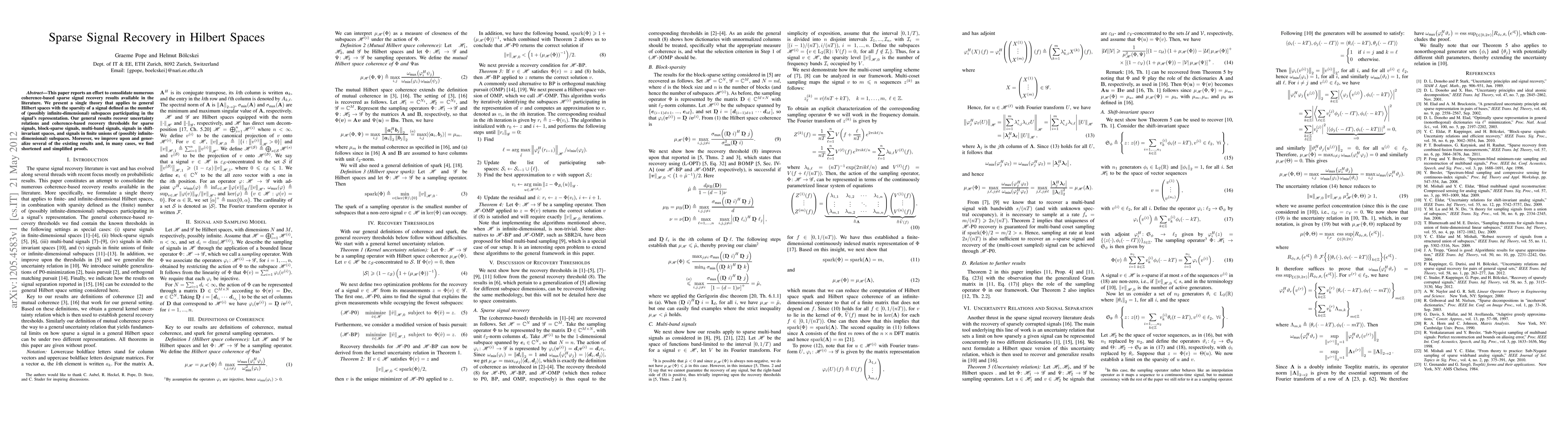 This paper unifies various coherence-based sparse signal recovery theories in Hilbert spaces, presenting a general framework that applies to diverse signal types, and offers improved and simplified proofs for existing results. The theory encompasses uncertainty relations and recovery thresholds for different sparse signal categories.
