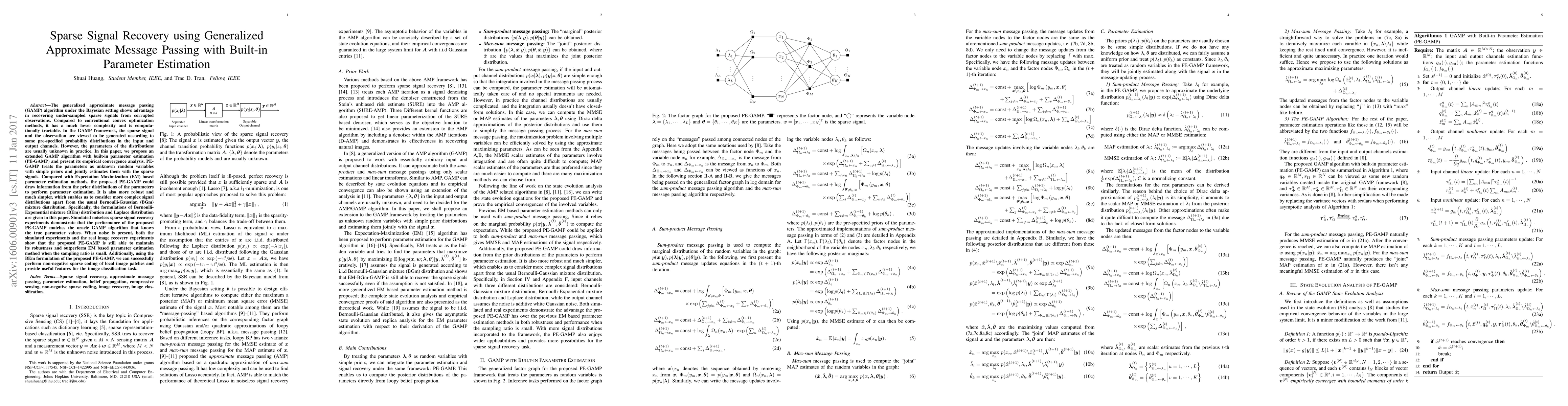The generalized approximate message passing (GAMP) algorithm under the Bayesian setting shows advantage in recovering under-sampled sparse signals from corrupted observations. Compared to conventional convex optimization methods, it has a much lower complexity and is computationally tractable. In the GAMP framework, the sparse signal and the observation are viewed to be generated according to some pre-specified probability distributions in the input and output channels. However, the parameters of the distributions are usually unknown in practice. In this paper, we propose an extended GAMP algorithm with built-in parameter estimation (PE-GAMP) and present its empirical convergence analysis. PE-GAMP treats the parameters as unknown random variables with simple priors and jointly estimates them with the sparse signals. Compared with Expectation Maximization (EM) based parameter estimation methods, the proposed PE-GAMP could draw information from the prior distributions of the parameters to perform parameter estimation. It is also more robust and much simpler, which enables us to consider more complex signal distributions apart from the usual Bernoulli-Gaussian (BGm) mixture distribution. Specifically, the formulations of Bernoulli-Exponential mixture (BEm) distribution and Laplace distribution are given in this paper. Simulated noiseless sparse signal recovery experiments demonstrate that the performance of the proposed PE-GAMP matches the oracle GAMP algorithm. When noise is present, both the simulated experiments and the real image recovery experiments show that PE-GAMP is still able to maintain its robustness and outperform EM based parameter estimation method when the sampling ratio is small. Additionally, using the BEm formulation of the PE-GAMP, we can successfully perform non-negative sparse coding of local image patches and provide useful features for the image classification task.