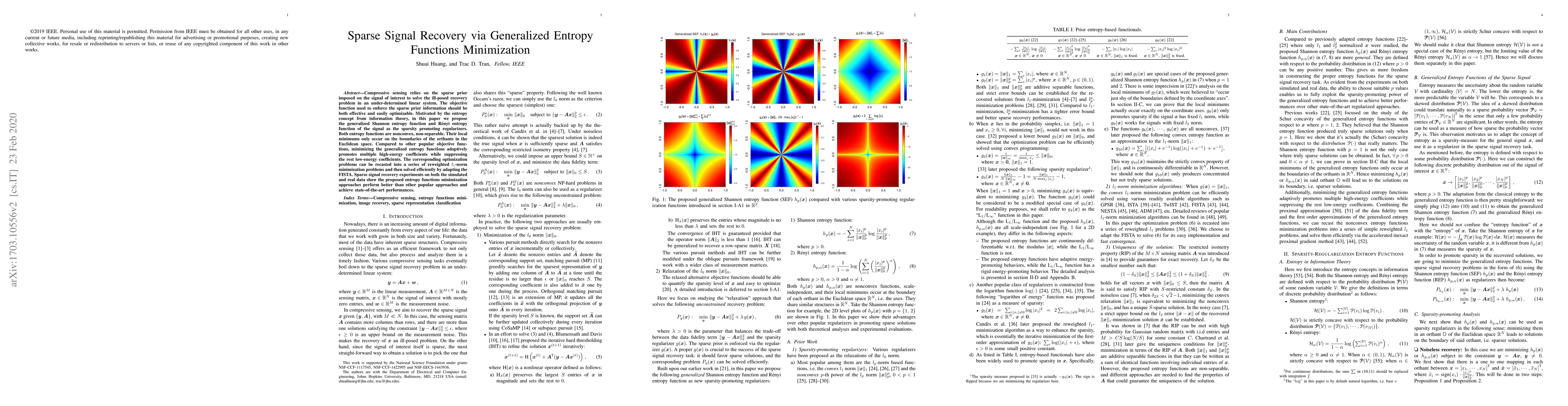 Compressive sensing relies on the sparse prior imposed on the signal of interest to solve the ill-posed recovery problem in an under-determined linear system. The objective function used to enforce the sparse prior information should be both effective and easily optimizable. Motivated by the entropy concept from information theory, in this paper we propose the generalized Shannon entropy function and R\'{e}nyi entropy function of the signal as the sparsity promoting regularizers. Both entropy functions are nonconvex, non-separable. Their local minimums only occur on the boundaries of the orthants in the Euclidean space. Compared to other popular objective functions, minimizing the generalized entropy functions adaptively promotes multiple high-energy coefficients while suppressing the rest low-energy coefficients. The corresponding optimization problems can be recasted into a series of reweighted $l_1$-norm minimization problems and then solved efficiently by adapting the FISTA. Sparse signal recovery experiments on both the simulated and real data show the proposed entropy functions minimization approaches perform better than other popular approaches and achieve state-of-the-art performances.