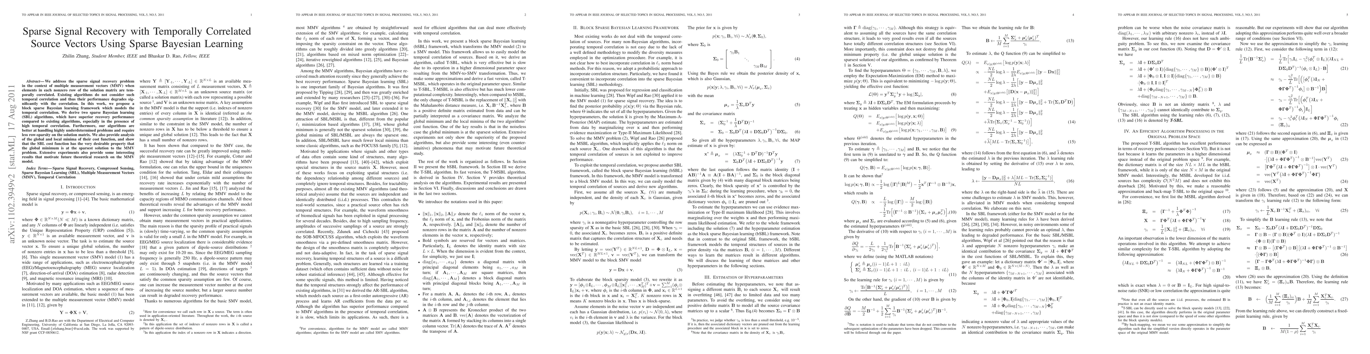 We address the sparse signal recovery problem in the context of multiple measurement vectors (MMV) when elements in each nonzero row of the solution matrix are temporally correlated. Existing algorithms do not consider such temporal correlations and thus their performance degrades significantly with the correlations. In this work, we propose a block sparse Bayesian learning framework which models the temporal correlations. In this framework we derive two sparse Bayesian learning (SBL) algorithms, which have superior recovery performance compared to existing algorithms, especially in the presence of high temporal correlations. Furthermore, our algorithms are better at handling highly underdetermined problems and require less row-sparsity on the solution matrix. We also provide analysis of the global and local minima of their cost function, and show that the SBL cost function has the very desirable property that the global minimum is at the sparsest solution to the MMV problem. Extensive experiments also provide some interesting results that motivate future theoretical research on the MMV model.