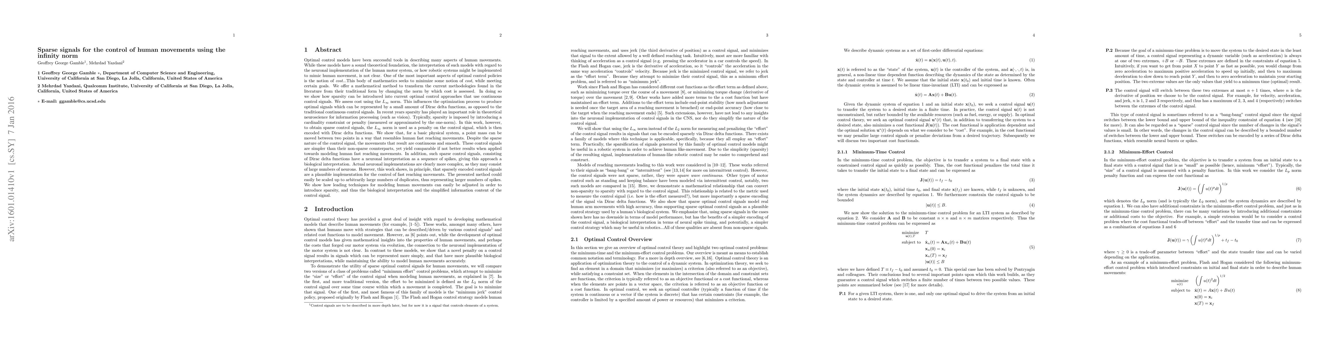 This paper proposes a method to transform optimal control models of human movements by using the infinity norm to assess cost, resulting in sparse control signals represented by Dirac delta functions. These sparse signals, resembling sequences of spikes, simplify the control signals while maintaining smooth, continuous movements, offering a biologically plausible approach to movement control.