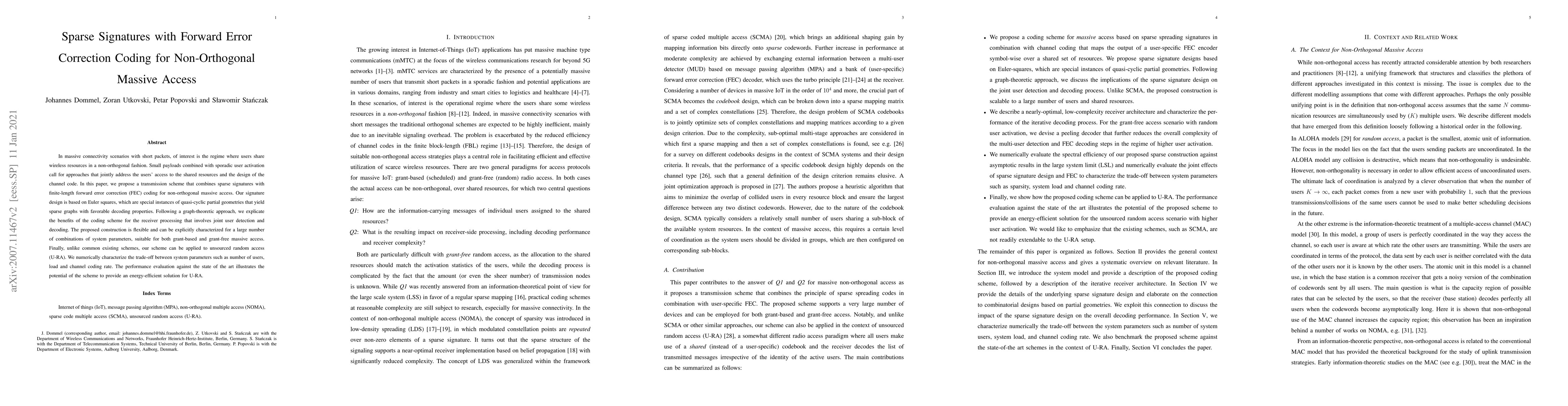 This paper proposes a novel transmission scheme combining sparse signatures and finite-length forward error correction coding for non-orthogonal massive access, leveraging Euler squares for efficient user detection and decoding. The scheme is shown to provide an energy-efficient solution for unsourced random access, outperforming existing methods.