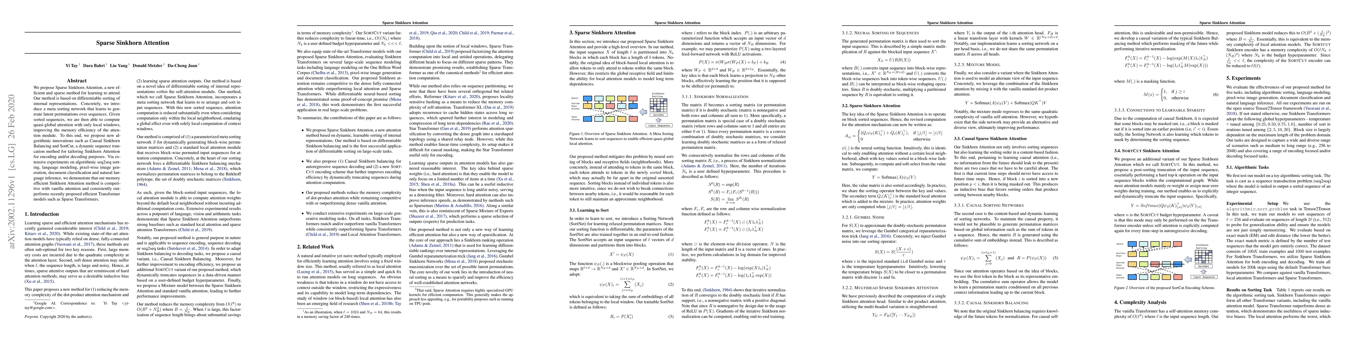 Sparse Sinkhorn Attention introduces a novel, memory-efficient method for attention learning based on differentiable sorting and quasi-global attention with local windows, outperforming other efficient Transformer models in various tasks. The method employs innovations like Causal Sinkhorn Balancing and SortCut for dynamic sequence truncation.
