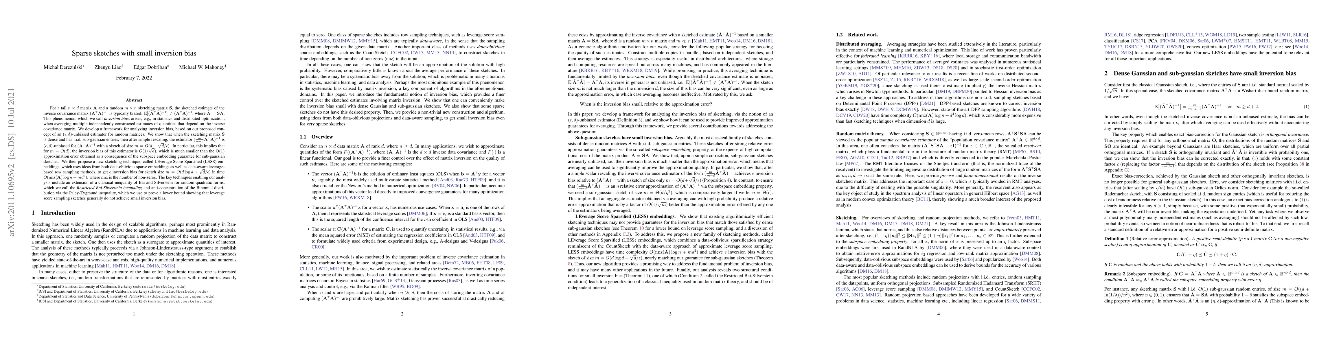A new framework analyzes inversion bias in sparse sketches, reducing bias to $O(1/ ext{sqrt}(d))$ with sketch size $m=O(d)$, and introduces a novel technique called LESS embeddings that achieves $ ext{poly}(d, ext{log} d + 1/ ext{eps})$ inversion bias.