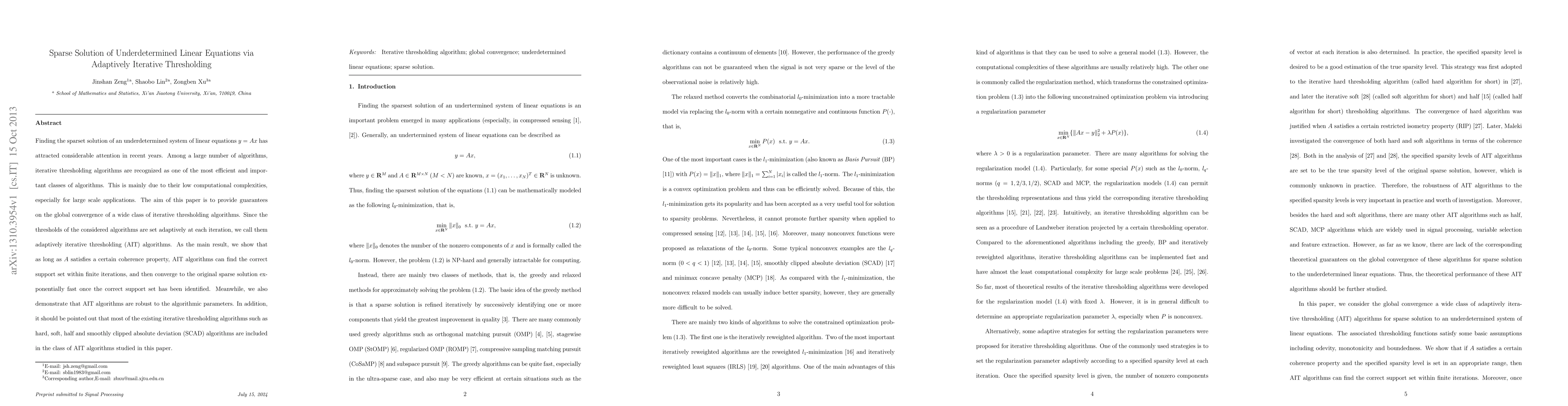 This paper proposes adaptively iterative thresholding (AIT) algorithms for finding sparse solutions to underdetermined linear equations. It provides theoretical guarantees for the global convergence of AIT algorithms, showing they can identify the correct support set and converge exponentially fast once it is found, while being robust to algorithmic parameters.