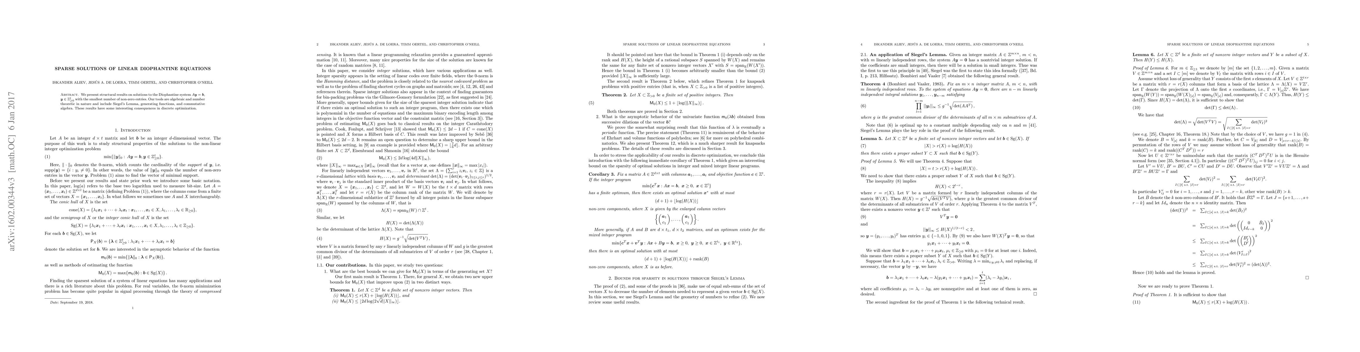 This paper explores sparse solutions to linear Diophantine equations with the fewest non-zero entries, employing algebraic and number-theoretic methods like Siegel's Lemma and generating functions, with implications for discrete optimization.