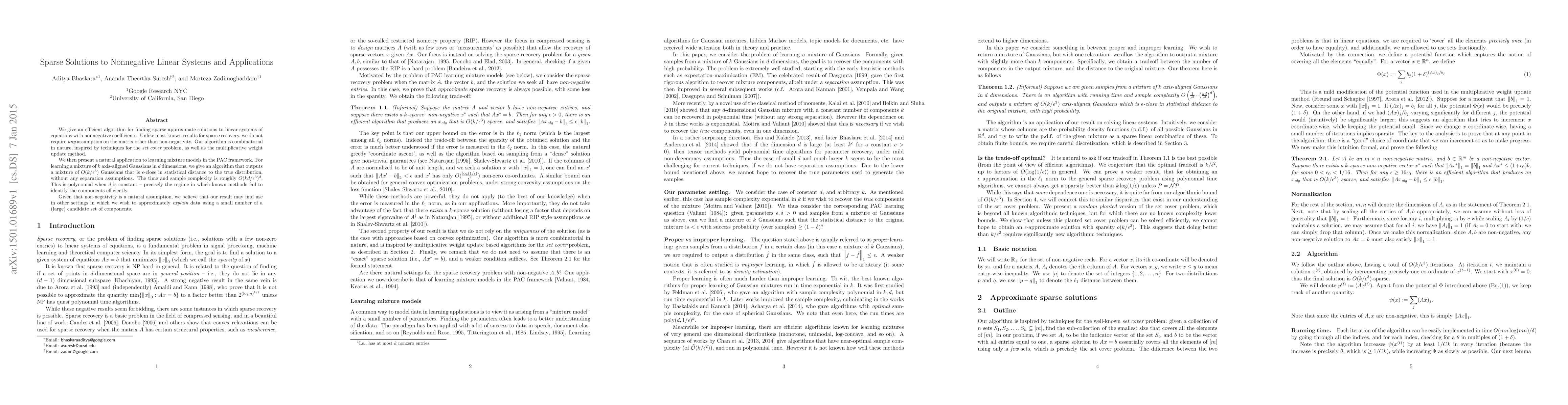 We give an efficient algorithm for finding sparse approximate solutions to linear systems of equations with nonnegative coefficients. Unlike most known results for sparse recovery, we do not require {\em any} assumption on the matrix other than non-negativity. Our algorithm is combinatorial in nature, inspired by techniques for the set cover problem, as well as the multiplicative weight update method. We then present a natural application to learning mixture models in the PAC framework. For learning a mixture of $k$ axis-aligned Gaussians in $d$ dimensions, we give an algorithm that outputs a mixture of $O(k/\epsilon^3)$ Gaussians that is $\epsilon$-close in statistical distance to the true distribution, without any separation assumptions. The time and sample complexity is roughly $O(kd/\epsilon^3)^{d}$. This is polynomial when $d$ is constant -- precisely the regime in which known methods fail to identify the components efficiently. Given that non-negativity is a natural assumption, we believe that our result may find use in other settings in which we wish to approximately explain data using a small number of a (large) candidate set of components.