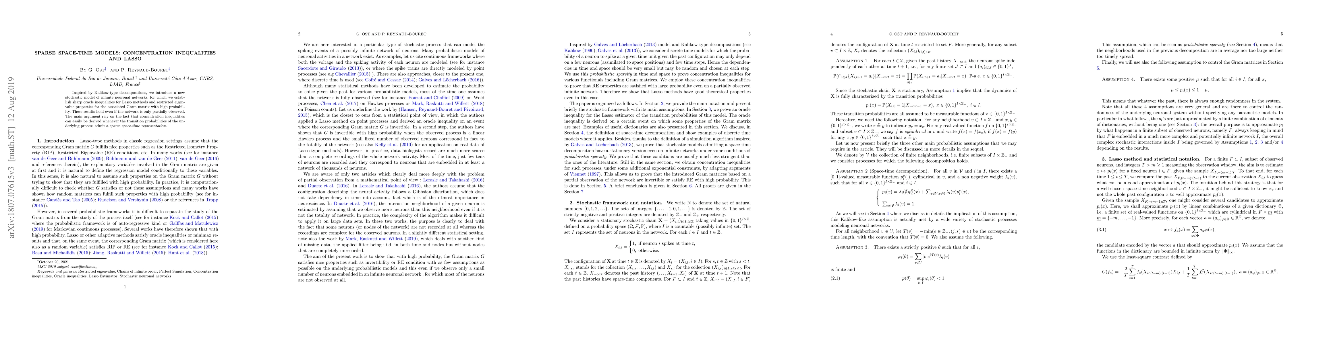 Inspired by Kalikow-type decompositions, we introduce a new stochastic model of infinite neuronal networks, for which we establish sharp oracle inequalities for Lasso methods and restricted eigenvalue properties for the associated Gram matrix with high probability. These results hold even if the network is only partially observed. The main argument rely on the fact that concentration inequalities can easily be derived whenever the transition probabilities of the underlying process admit a sparse space-time representation.