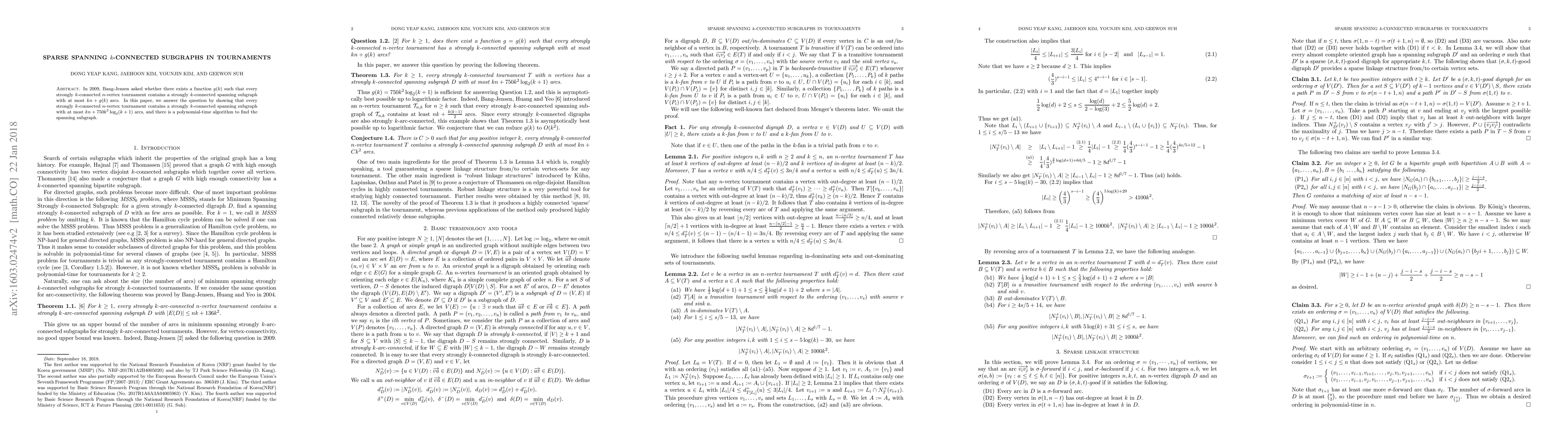 This paper resolves Bang-Jensen's 2009 question by proving that every strongly $k$-connected $n$-vertex tournament contains a strongly $k$-connected spanning subgraph with at most $kn + 750k^2\log(k+1)$ arcs. This provides a specific function $g(k)$ for sparse spanning subgraphs.