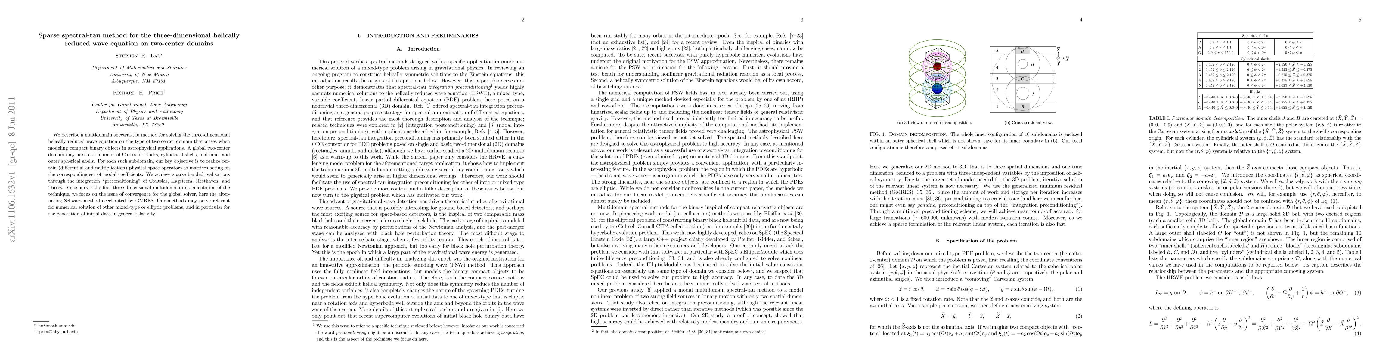 This paper introduces a novel multidomain spectral-tau method for solving the three-dimensional helically reduced wave equation on two-center domains, focusing on compact binary objects in astrophysics. The method achieves sparse banded realizations through preconditioning, and explores convergence using the alternating Schwarz method with GMRES acceleration.