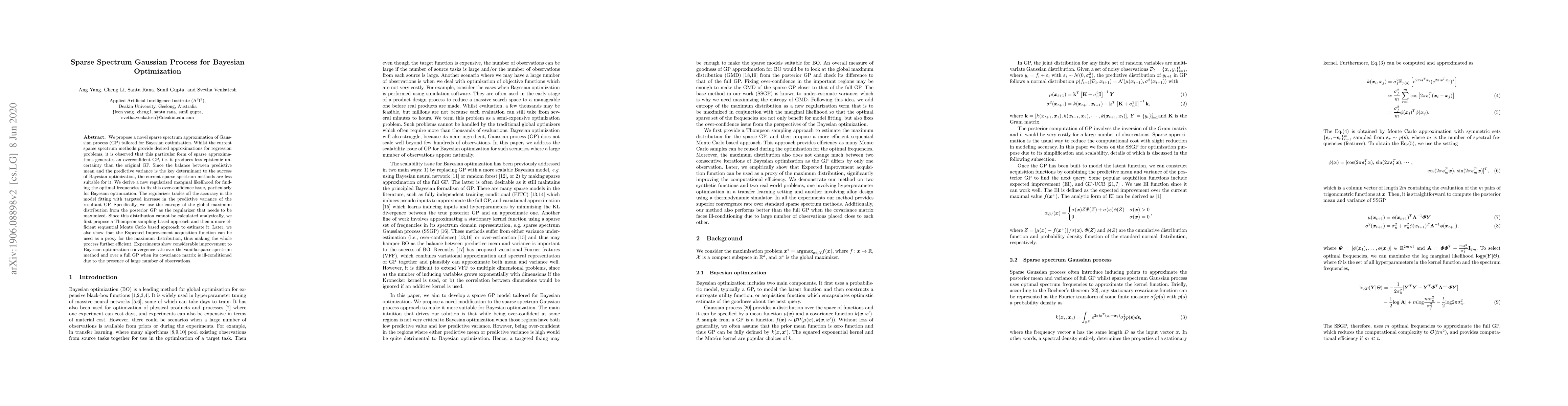 We propose a novel sparse spectrum approximation of Gaussian process (GP) tailored for Bayesian optimization. Whilst the current sparse spectrum methods provide desired approximations for regression problems, it is observed that this particular form of sparse approximations generates an overconfident GP, i.e. it produces less epistemic uncertainty than the original GP. Since the balance between predictive mean and the predictive variance is the key determinant to the success of Bayesian optimization, the current sparse spectrum methods are less suitable for it. We derive a new regularized marginal likelihood for finding the optimal frequencies to fix this over-confidence issue, particularly for Bayesian optimization. The regularizer trades off the accuracy in the model fitting with a targeted increase in the predictive variance of the resultant GP. Specifically, we use the entropy of the global maximum distribution from the posterior GP as the regularizer that needs to be maximized. Since this distribution cannot be calculated analytically, we first propose a Thompson sampling based approach and then a more efficient sequential Monte Carlo based approach to estimate it. Later, we also show that the Expected Improvement acquisition function can be used as a proxy for the maximum distribution, thus making the whole process further efficient. Experiments show considerable improvement to Bayesian optimization convergence rate over the vanilla sparse spectrum method and over a full GP when its covariance matrix is ill-conditioned due to the presence of a large number of observations.