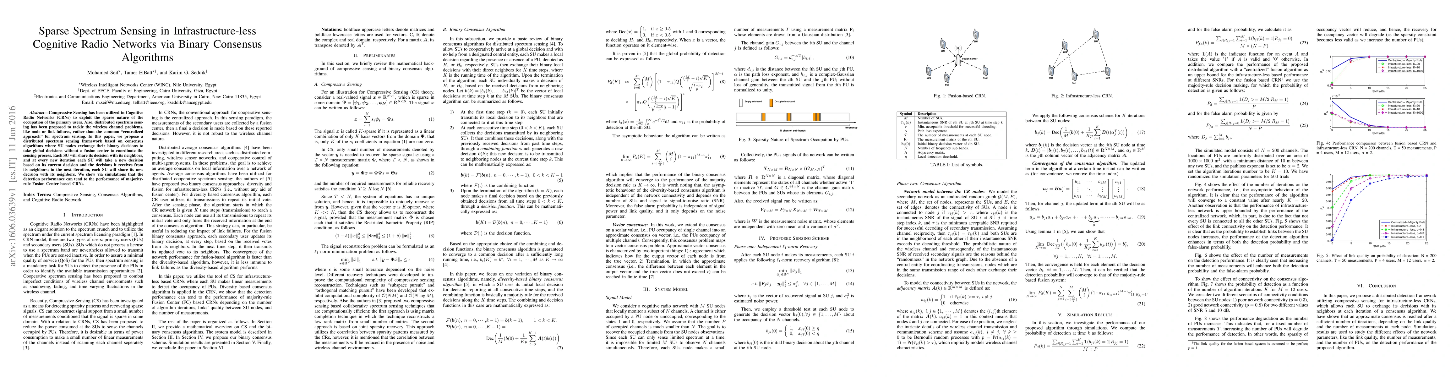 Compressive Sensing has been utilized in Cognitive Radio Networks (CRNs) to exploit the sparse nature of the occupation of the primary users. Also, distributed spectrum sensing has been proposed to tackle the wireless channel problems, like node or link failures, rather than the common (centralized approach) for spectrum sensing. In this paper, we propose a distributed spectrum sensing framework based on consensus algorithms where SU nodes exchange their binary decisions to take global decisions without a fusion center to coordinate the sensing process. Each SU will share its decision with its neighbors, and at every new iteration each SU will take a new decision based on its current decision and the decisions it receives from its neighbors; in the next iteration, each SU will share its new decision with its neighbors. We show via simulations that the detection performance can tend to the performance of majority rule Fusion Center based CRNs.