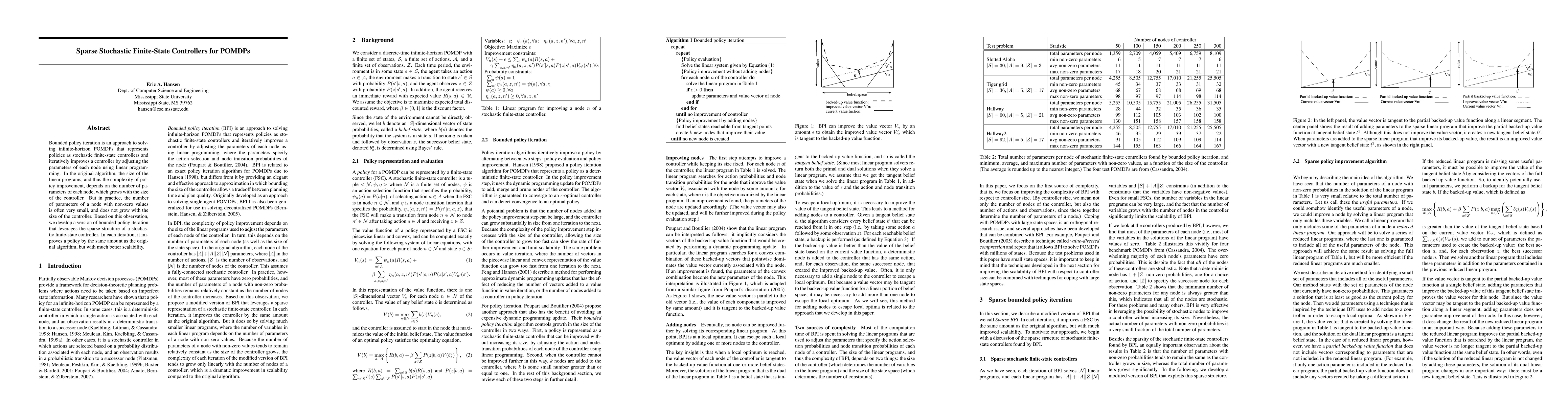 This paper proposes a sparse version of bounded policy iteration for solving infinite-horizon POMDPs, leveraging the often sparse structure of stochastic finite-state controllers to improve scalability and reduce computational complexity compared to the original algorithm.