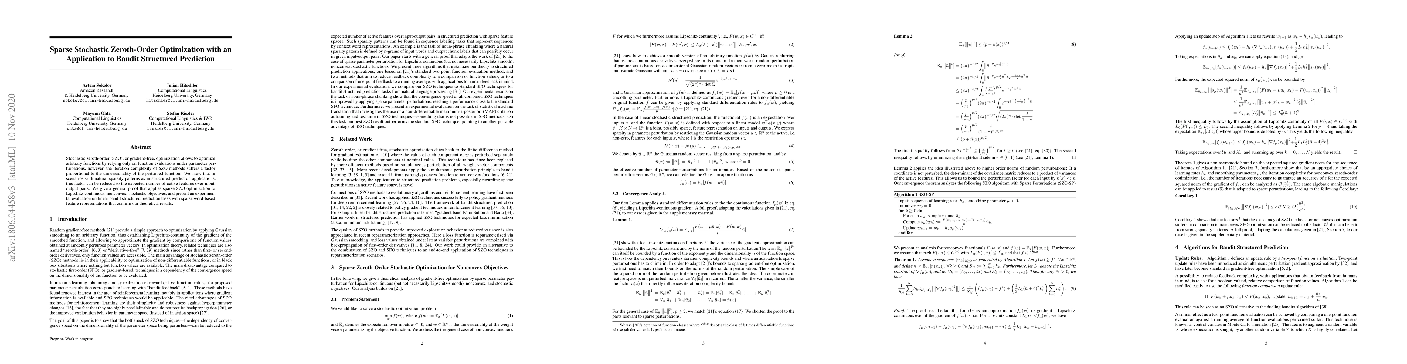 This paper proposes a sparse stochastic zeroth-order optimization method that reduces iteration complexity by leveraging natural sparsity patterns in structured prediction applications. The authors provide a theoretical proof and experimental validation on linear bandit structured prediction tasks, demonstrating the effectiveness of their approach.