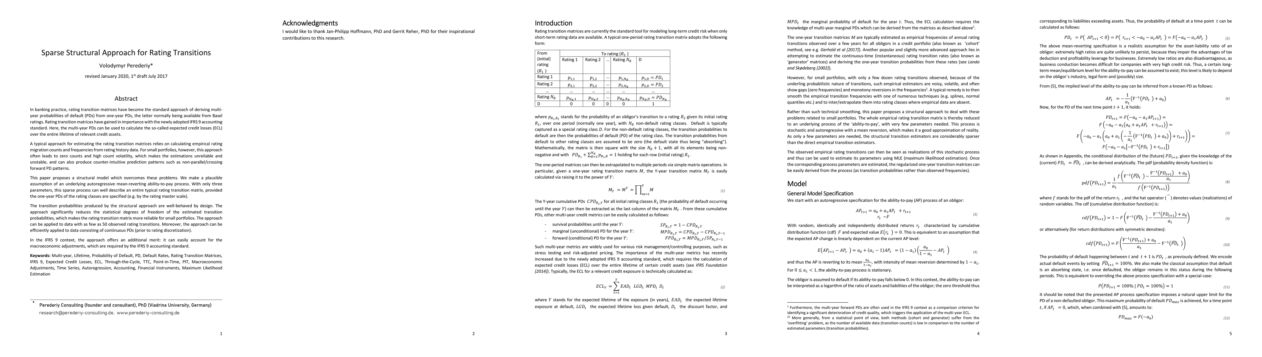 In banking practice, rating transition matrices have become the standard approach of deriving multi-year probabilities of default (PDs) from one-year PDs, the latter normally being available from Basel ratings. Rating transition matrices have gained in importance with the newly adopted IFRS 9 accounting standard. Here, the multi-year PDs can be used to calculate the so-called expected credit losses (ECL) over the entire lifetime of relevant credit assets. A typical approach for estimating the rating transition matrices relies on calculating empirical rating migration counts and frequencies from rating history data. For small portfolios, however, this approach often leads to zero counts and high count volatility, which makes the estimations unreliable and unstable, and can also produce counter-intuitive prediction patterns such as non-parallel/crossing forward PD patterns. This paper proposes a structural model which overcomes these problems. We make a plausible assumption of an underlying autoregressive mean-reverting ability-to-pay process. With only three parameters, this sparse process can well describe an entire typical rating transition matrix, provided the one-year PDs of the rating classes are specified. The transition probabilities produced by the structural approach are well-behaved by design. The approach significantly reduces the statistical degrees of freedom of the estimated transition probabilities, which makes the rating transition matrix more reliable for small portfolios. The approach can be applied to data with as few as 50 observed rating transitions. Moreover, the approach can be efficiently applied to data consisting of continuous PDs (prior to rating discretization). In the IFRS 9 context, the approach offers an additional merit: it can easily account for the macroeconomic adjustments, which are required by the IFRS 9 accounting standard.