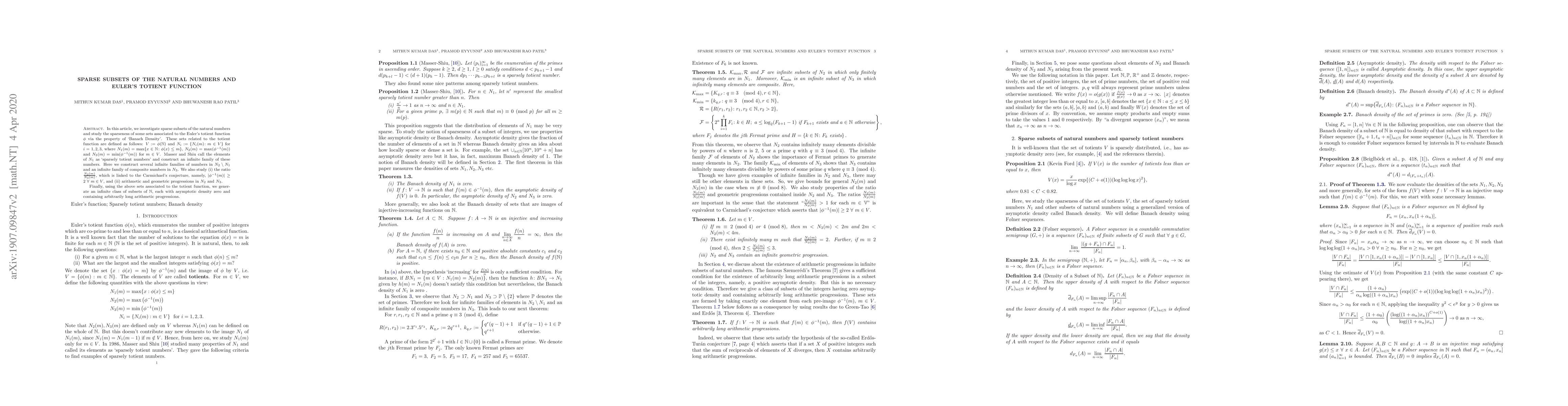 In this article, we investigate sparse subsets of the natural numbers and study the sparseness of some sets associated with the Euler's totient function $\phi$ via the property of `Banach Density'. These sets related to the totient function are defined as follows: $V:=\phi(\mathbb{N})$ and $N_i:=\{N_i(m)\colon m\in V \}$ for $i = 1, 2, 3,$ where $N_1(m)=\max\{x\in \mathbb{N}\colon \phi(x)\leq m\}$, $N_2(m)=\max(\phi^{-1}(m))$ and $N_3(m)=\min(\phi^{-1}(m))$ for $ m\in V$. Masser and Shiu call the elements of $N_1$ as `sparsely totient numbers' and construct an infinite family of these numbers. Here we construct several infinite families of numbers in $N_2\setminus N_1$ and an infinite family of composite numbers in $N_3$. We also study (i) the ratio $\frac{N_2(m)}{N_3(m)}$, which is linked to the Carmichael's conjecture, namely, $|\phi^{-1}(m)|\geq 2 ~\forall ~ m\in V$, and (ii) arithmetic and geometric progressions in $N_2$ and $N_3$. Finally, using the above sets associated to the totient function, we generate an infinite class of subsets of $\mathbb{N}$, each with asymptotic density zero and containing arbitrarily long arithmetic progressions.