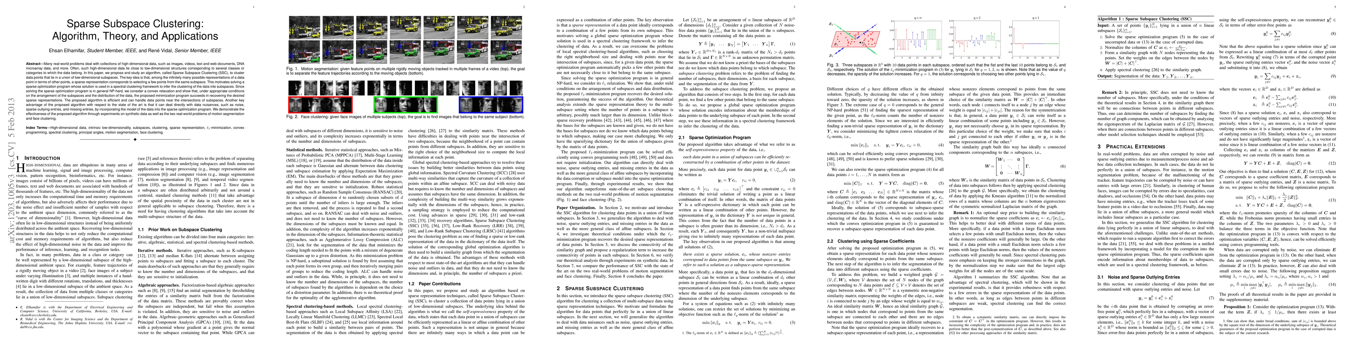 In many real-world problems, we are dealing with collections of high-dimensional data, such as images, videos, text and web documents, DNA microarray data, and more. Often, high-dimensional data lie close to low-dimensional structures corresponding to several classes or categories the data belongs to. In this paper, we propose and study an algorithm, called Sparse Subspace Clustering (SSC), to cluster data points that lie in a union of low-dimensional subspaces. The key idea is that, among infinitely many possible representations of a data point in terms of other points, a sparse representation corresponds to selecting a few points from the same subspace. This motivates solving a sparse optimization program whose solution is used in a spectral clustering framework to infer the clustering of data into subspaces. Since solving the sparse optimization program is in general NP-hard, we consider a convex relaxation and show that, under appropriate conditions on the arrangement of subspaces and the distribution of data, the proposed minimization program succeeds in recovering the desired sparse representations. The proposed algorithm can be solved efficiently and can handle data points near the intersections of subspaces. Another key advantage of the proposed algorithm with respect to the state of the art is that it can deal with data nuisances, such as noise, sparse outlying entries, and missing entries, directly by incorporating the model of the data into the sparse optimization program. We demonstrate the effectiveness of the proposed algorithm through experiments on synthetic data as well as the two real-world problems of motion segmentation and face clustering.