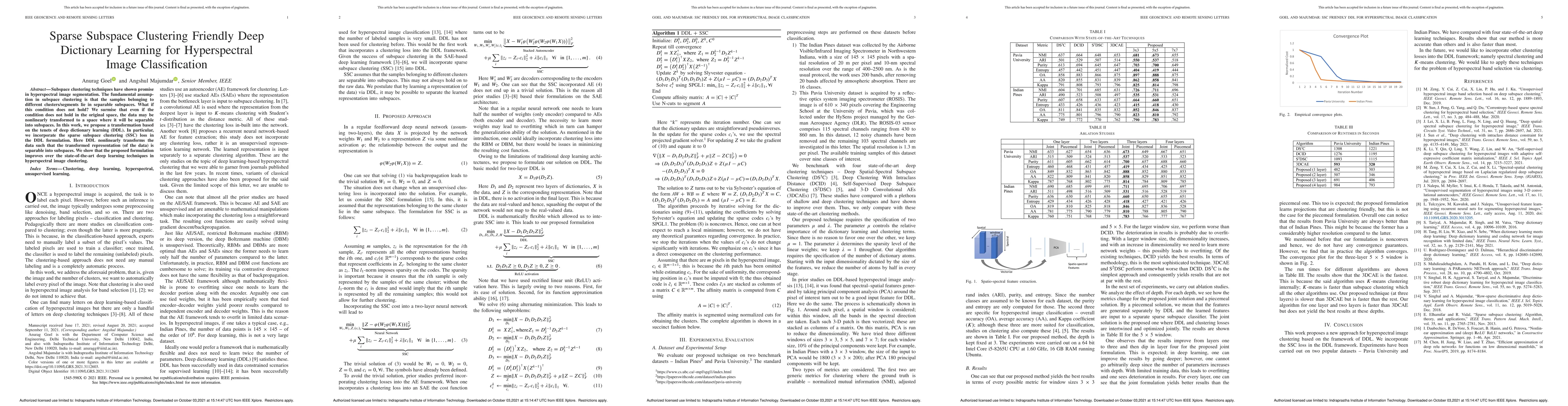 This paper proposes a deep dictionary learning approach that integrates sparse subspace clustering to improve hyperspectral image classification. By transforming data nonlinearly, the method ensures that samples are separable into subspaces, enhancing clustering performance over existing deep learning techniques.