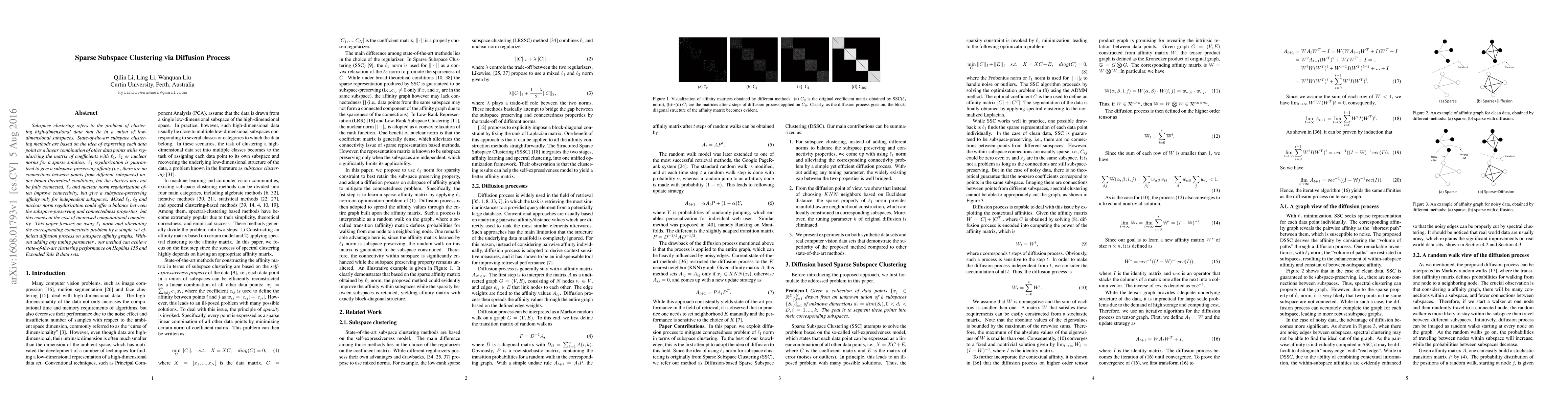 This paper proposes a method for sparse subspace clustering using L1 norm regularization to achieve subspace-preserving affinity, addressing connectivity issues through a diffusion process on subspace affinity graphs, achieving state-of-the-art performance on Hopkins 155 and Extended Yale B datasets without additional tuning parameters.