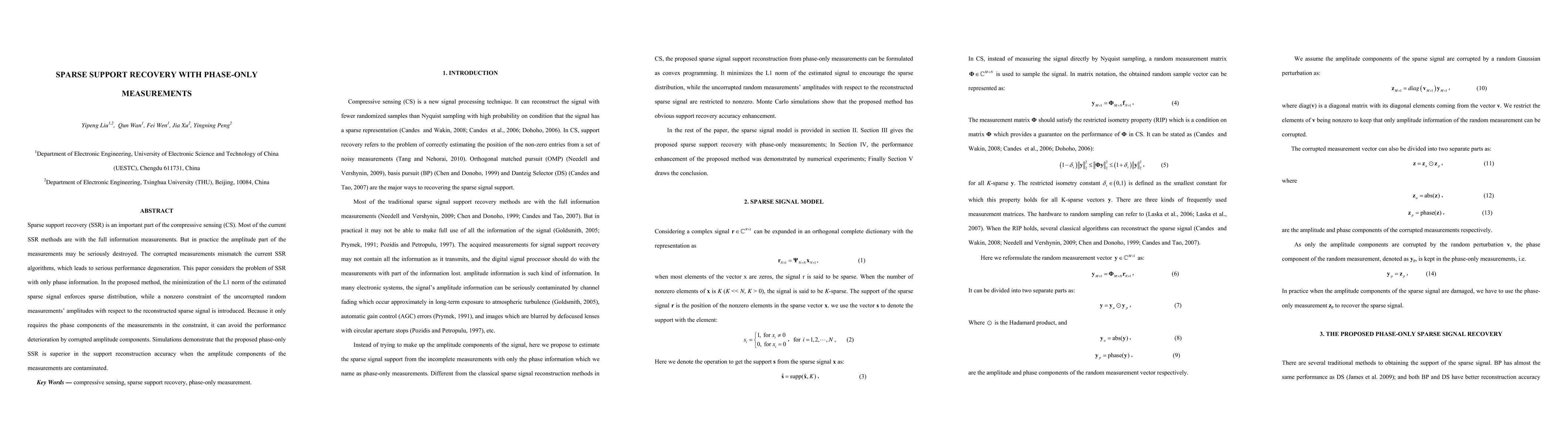 The proposed phase-only sparse signal recovery (POSSR) method provides a novel solution for recovering support of sparse signals when part of the amplitude information is lost.