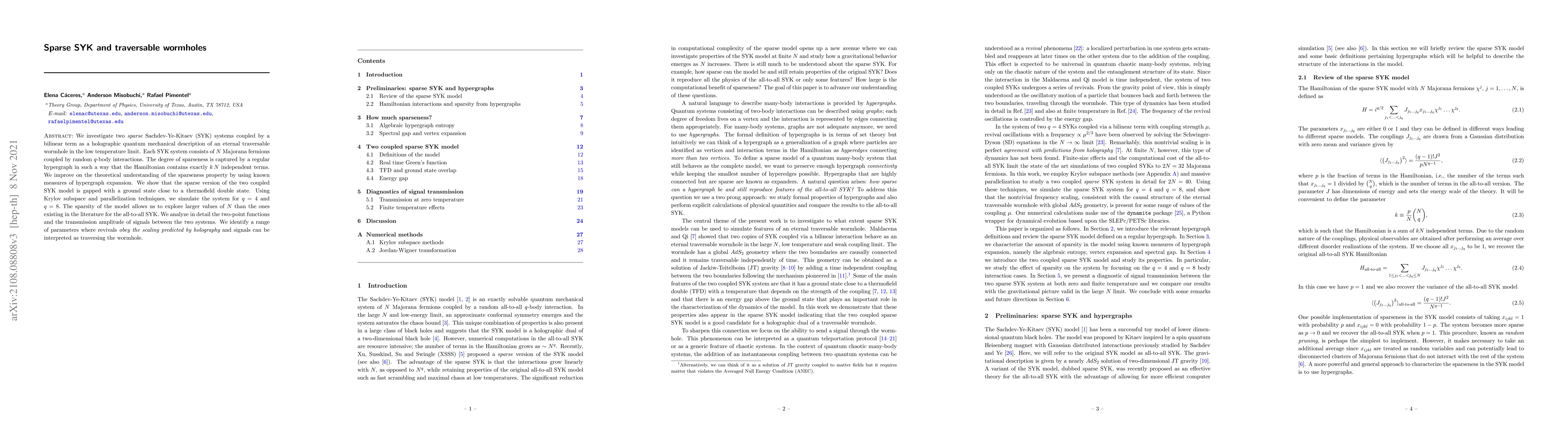 This paper explores sparse Sachdev-Ye-Kitaev (SYK) systems coupled by a bilinear term to model traversable wormholes, demonstrating that the sparse model is gapped and exhibits revivals consistent with holographic predictions. Simulations reveal signal transmission behavior indicative of wormhole traversal.