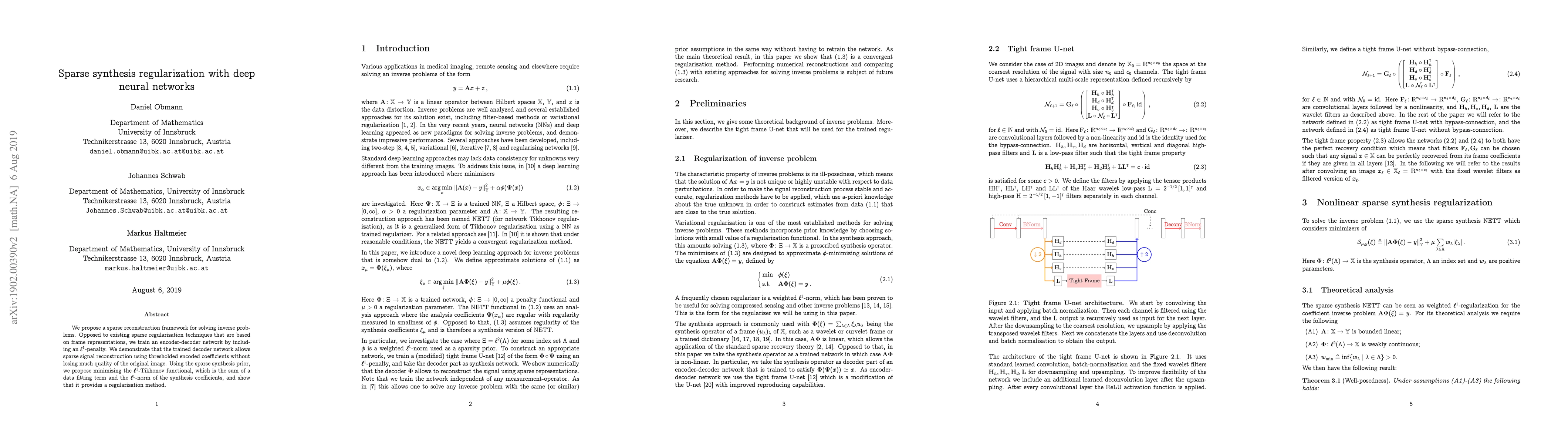 We propose a sparse reconstruction framework for solving inverse problems. Opposed to existing sparse regularization techniques that are based on frame representations, we train an encoder-decoder network by including an $\ell^1$-penalty. We demonstrate that the trained decoder network allows sparse signal reconstruction using thresholded encoded coefficients without losing much quality of the original image. Using the sparse synthesis prior, we propose minimizing the $\ell^1$-Tikhonov functional, which is the sum of a data fitting term and the $\ell^1$-norm of the synthesis coefficients, and show that it provides a regularization method.