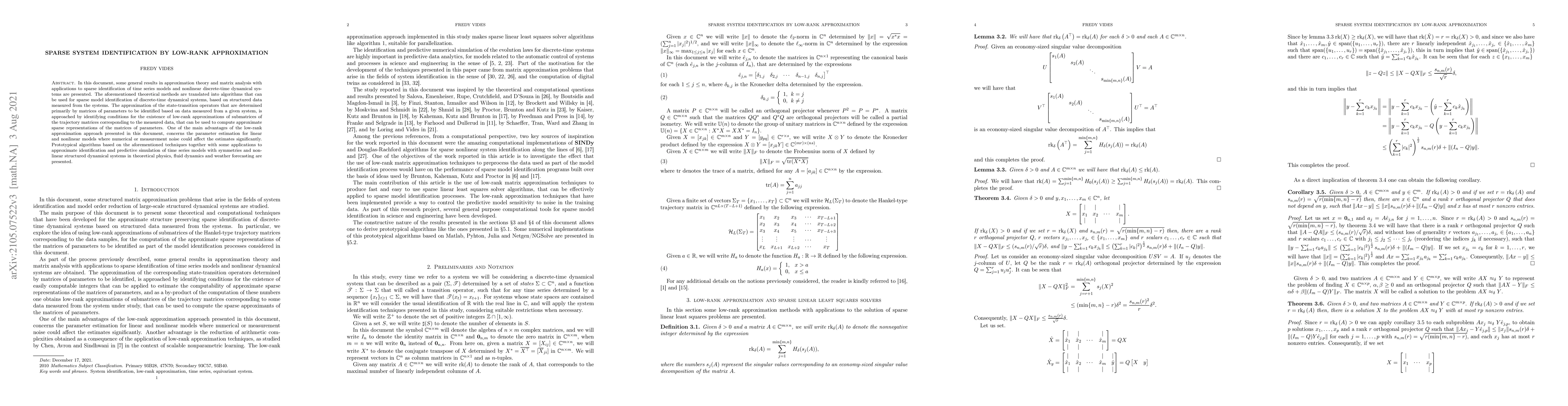 In this document, some general results in approximation theory and matrix analysis with applications to sparse identification of time series models and nonlinear discrete-time dynamical systems are presented. The aforementioned theoretical methods are translated into algorithms that can be used for sparse model identification of discrete-time dynamical systems, based on structured data measured from the systems. The approximation of the state-transition operators that are determined primarily by matrices of parameters to be identified based on data measured from a given system, is approached by identifying conditions for the existence of low-rank approximations of submatrices of the trajectory matrices corresponding to the measured data, that can be used to compute approximate sparse representations of the matrices of parameters. One of the main advantages of the low-rank approximation approach presented in this document, concerns the parameter estimation for linear and nonlinear models where numerical or measurement noise could affect the estimates significantly. Prototypical algorithms based on the aforementioned techniques together with some applications to approximate identification and predictive simulation of time series models with symmetries and nonlinear structured dynamical systems in theoretical physics, fluid dynamics and weather forecasting are presented.