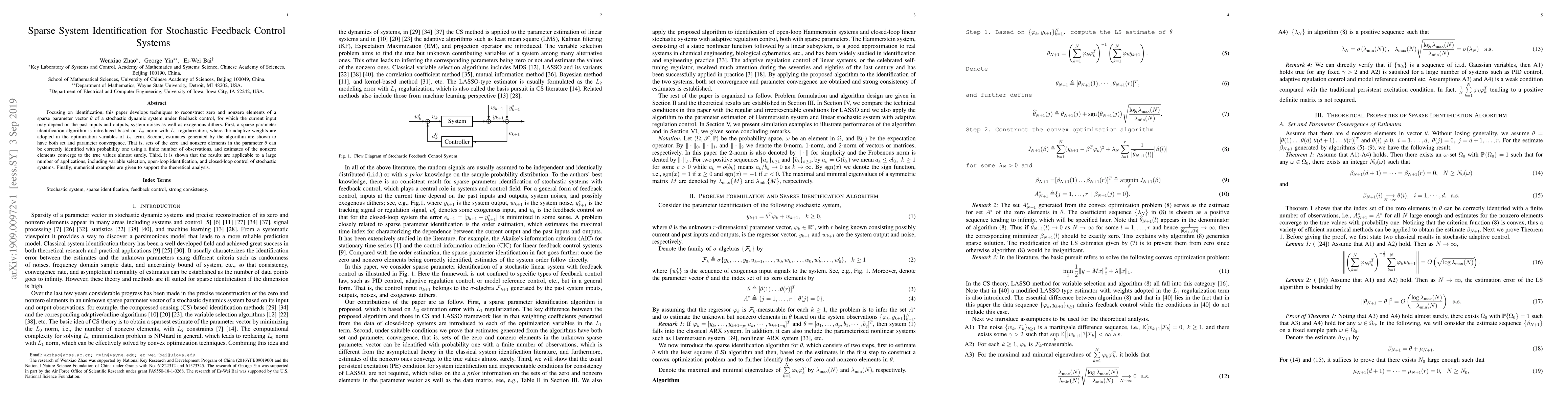 Focusing on identification, this paper develops techniques to reconstruct zero and nonzero elements of a sparse parameter vector of a stochastic dynamic system under feedback control, for which the current input may depend on the past inputs and outputs, system noises as well as exogenous dithers. First, a sparse parameter identification algorithm is introduced based on L2 norm with L1 regularization, where the adaptive weights are adopted in the optimization variables of L1 term. Second, estimates generated by the algorithm are shown to have both set and parameter convergence. That is, sets of the zero and nonzero elements in the parameter can be correctly identified with probability one using a finite number of observations, and estimates of the nonzero elements converge to the true values almost surely. Third, it is shown that the results are applicable to a large number of applications, including variable selection, open-loop identification, and closed-loop control of stochastic systems. Finally, numerical examples are given to support the theoretical analysis.