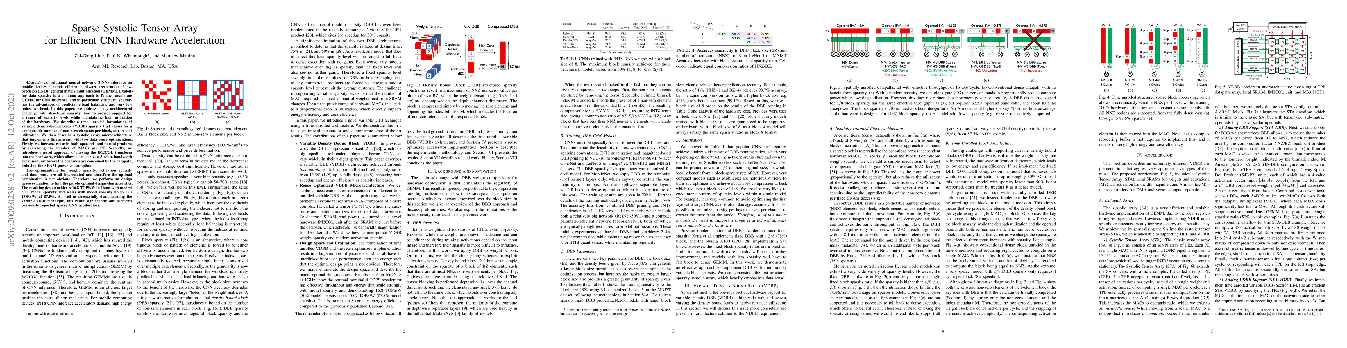 This paper proposes a sparse systolic tensor array architecture for efficient CNN hardware acceleration, leveraging structural sparsity to maintain high hardware utilization across varying sparsity levels. The design includes a time-unrolled variable density-bound block (VDBB) sparsity scheme and two data reuse optimizations, achieving 16.8 TOPS/W at 50% sparsity, scaling up to 55.7 TOPS/W at 87.5% sparsity, outperforming previous sparse CNN accelerators.