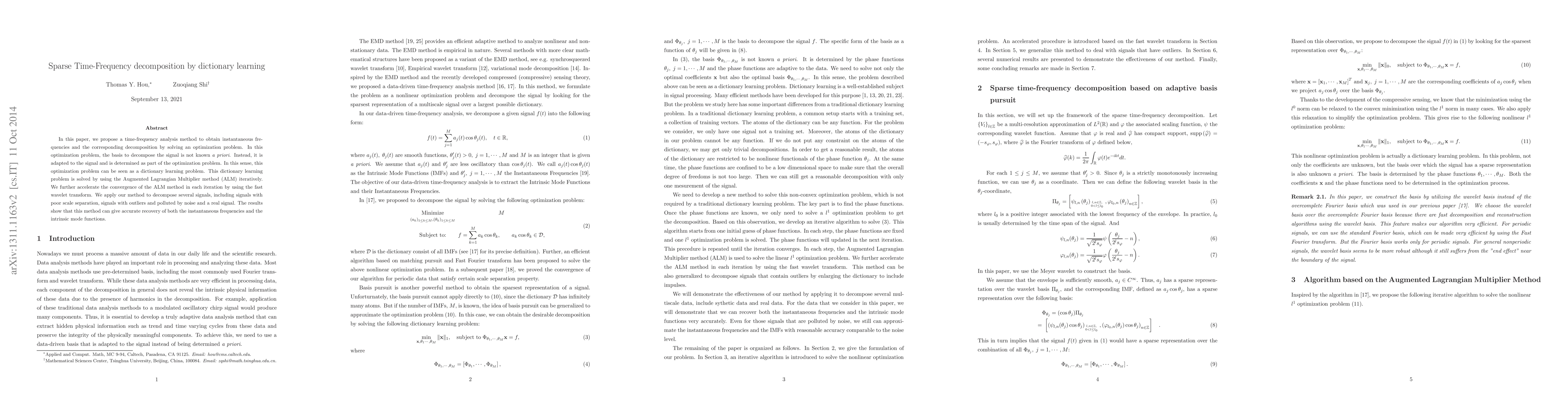 This paper introduces a novel time-frequency decomposition method using dictionary learning to adaptively determine the basis for signal decomposition. The method employs the Augmented Lagrangian Multiplier method and fast wavelet transform to achieve accurate recovery of instantaneous frequencies and intrinsic mode functions, even for noisy and outlier-contaminated signals.