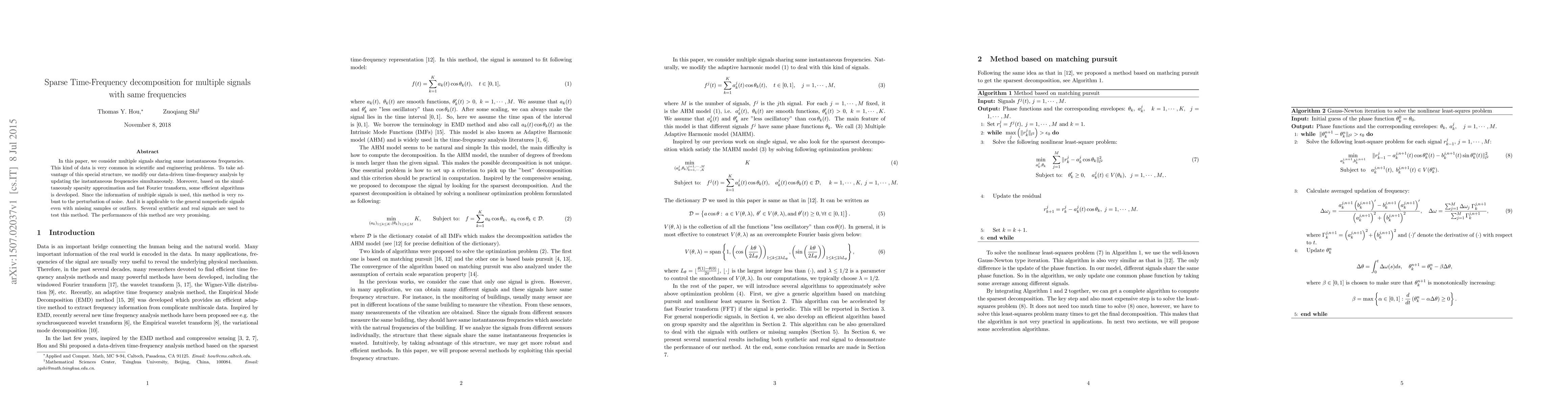 A new method for time-frequency analysis of multiple signals with shared frequencies is proposed, offering improved robustness to noise and applicability to non-periodic signals with missing samples or outliers.