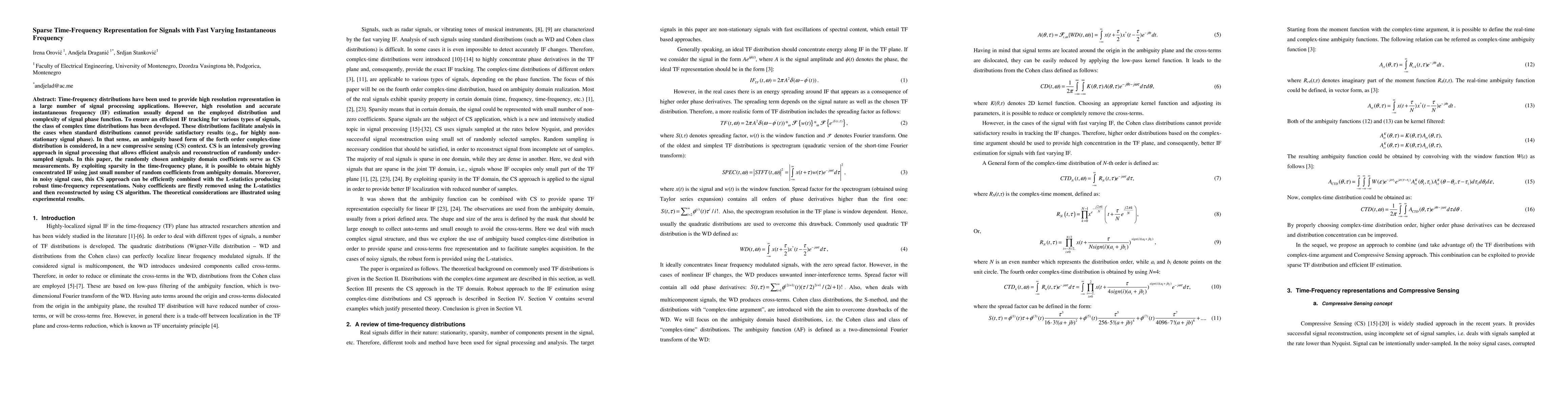 This paper proposes a sparse time-frequency representation method using compressive sensing for signals with rapidly changing instantaneous frequency. It leverages ambiguity domain coefficients as measurements to efficiently reconstruct signals with minimal sampling, combining L-statistics for noise reduction in a robust manner.