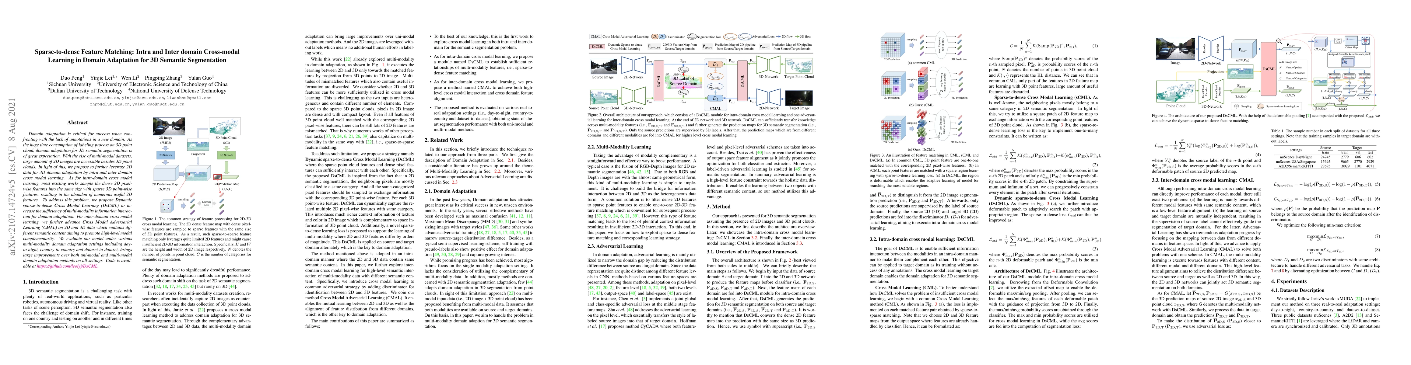 Domain adaptation is critical for success when confronting with the lack of annotations in a new domain. As the huge time consumption of labeling process on 3D point cloud, domain adaptation for 3D semantic segmentation is of great expectation. With the rise of multi-modal datasets, large amount of 2D images are accessible besides 3D point clouds. In light of this, we propose to further leverage 2D data for 3D domain adaptation by intra and inter domain cross modal learning. As for intra-domain cross modal learning, most existing works sample the dense 2D pixel-wise features into the same size with sparse 3D point-wise features, resulting in the abandon of numerous useful 2D features. To address this problem, we propose Dynamic sparse-to-dense Cross Modal Learning (DsCML) to increase the sufficiency of multi-modality information interaction for domain adaptation. For inter-domain cross modal learning, we further advance Cross Modal Adversarial Learning (CMAL) on 2D and 3D data which contains different semantic content aiming to promote high-level modal complementarity. We evaluate our model under various multi-modality domain adaptation settings including day-to-night, country-to-country and dataset-to-dataset, brings large improvements over both uni-modal and multi-modal domain adaptation methods on all settings.