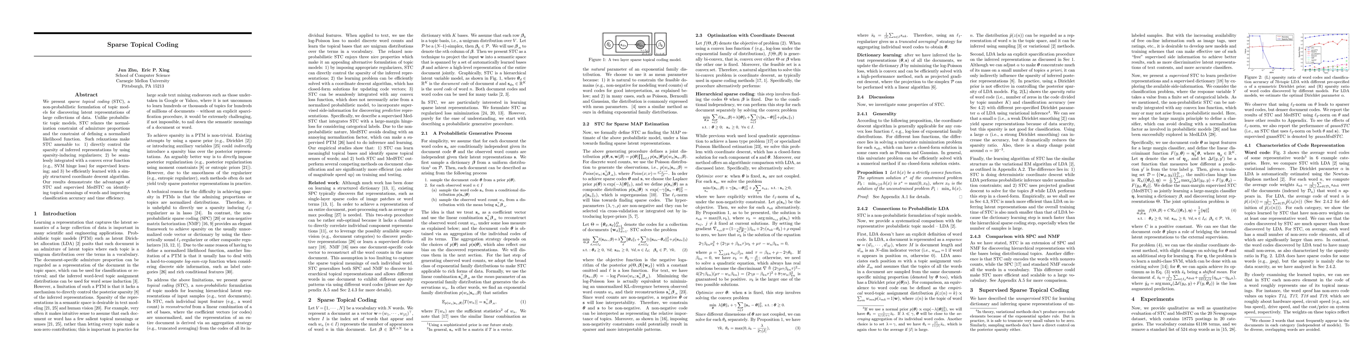 We present sparse topical coding (STC), a non-probabilistic formulation of topic models for discovering latent representations of large collections of data. Unlike probabilistic topic models, STC relaxes the normalization constraint of admixture proportions and the constraint of defining a normalized likelihood function. Such relaxations make STC amenable to: 1) directly control the sparsity of inferred representations by using sparsity-inducing regularizers; 2) be seamlessly integrated with a convex error function (e.g., SVM hinge loss) for supervised learning; and 3) be efficiently learned with a simply structured coordinate descent algorithm. Our results demonstrate the advantages of STC and supervised MedSTC on identifying topical meanings of words and improving classification accuracy and time efficiency.