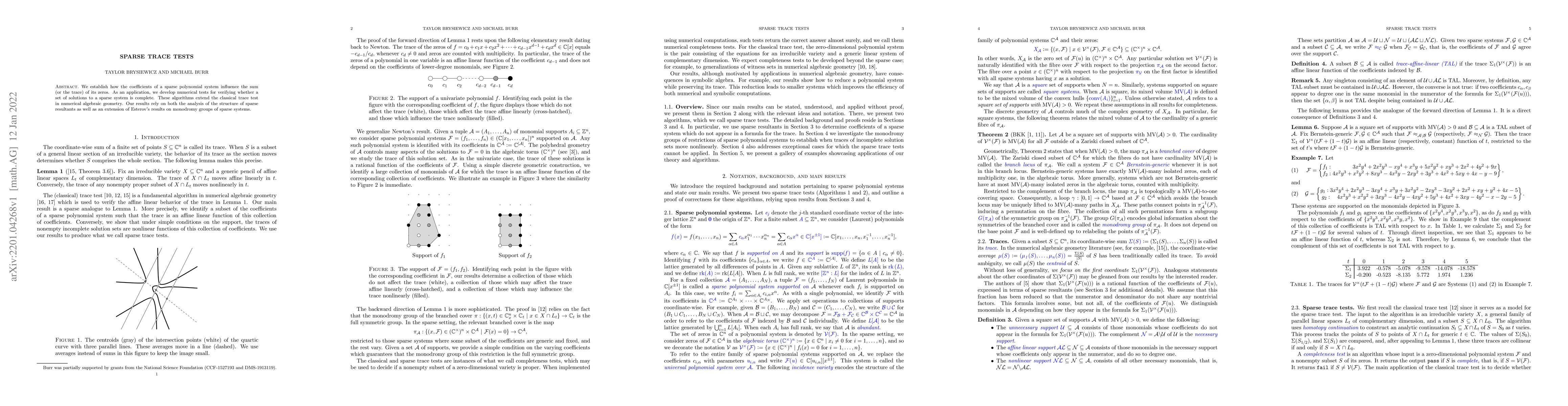 This paper investigates how sparse polynomial systems' coefficients affect the sum of their zeros, developing new numerical tests to verify the completeness of solution sets. It extends classical trace tests using insights from sparse resultants and Esterov's work on monodromy groups.