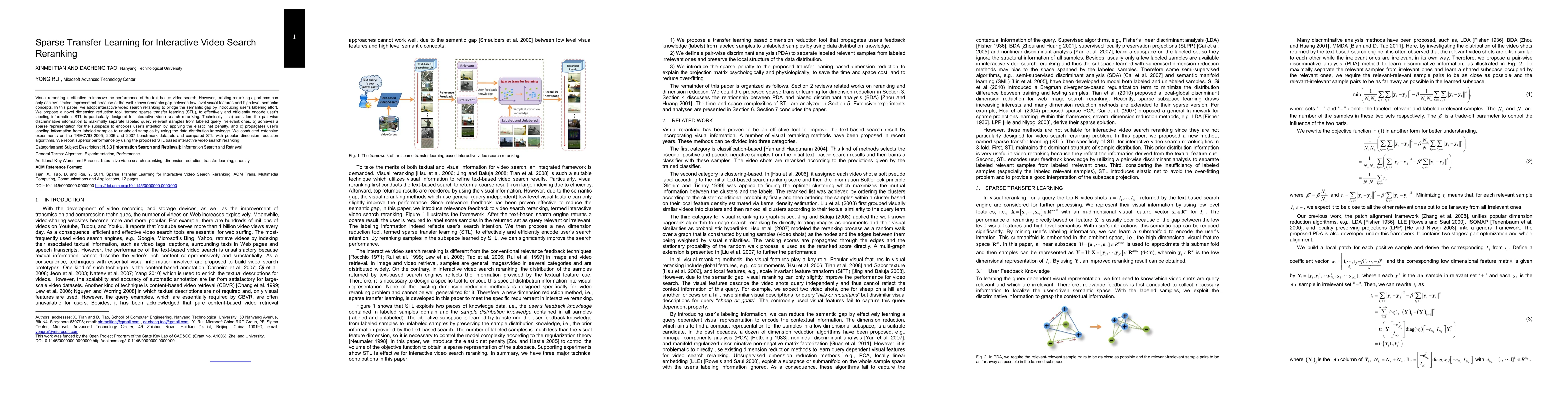 Visual reranking is effective to improve the performance of the text-based video search. However, existing reranking algorithms can only achieve limited improvement because of the well-known semantic gap between low level visual features and high level semantic concepts. In this paper, we adopt interactive video search reranking to bridge the semantic gap by introducing user's labeling effort. We propose a novel dimension reduction tool, termed sparse transfer learning (STL), to effectively and efficiently encode user's labeling information. STL is particularly designed for interactive video search reranking. Technically, it a) considers the pair-wise discriminative information to maximally separate labeled query relevant samples from labeled query irrelevant ones, b) achieves a sparse representation for the subspace to encodes user's intention by applying the elastic net penalty, and c) propagates user's labeling information from labeled samples to unlabeled samples by using the data distribution knowledge. We conducted extensive experiments on the TRECVID 2005, 2006 and 2007 benchmark datasets and compared STL with popular dimension reduction algorithms. We report superior performance by using the proposed STL based interactive video search reranking.