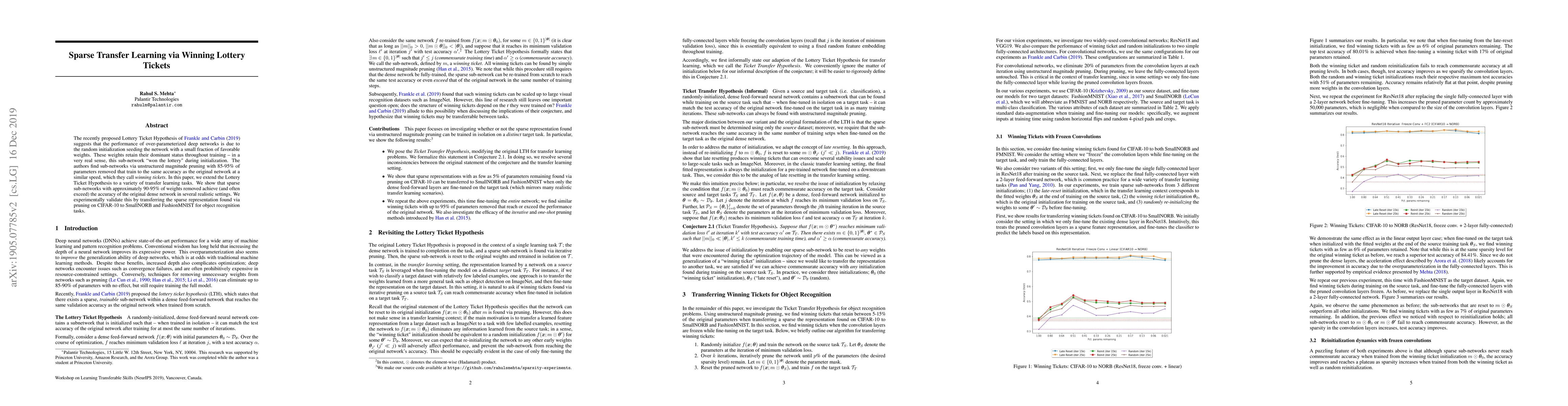 This paper extends the Lottery Ticket Hypothesis to transfer learning, demonstrating that sparse sub-networks with 90-95% fewer weights can achieve or exceed the accuracy of original dense networks in various tasks. Experiments show successful transfer from CIFAR-10 to SmallNORB and FashionMNIST for object recognition.