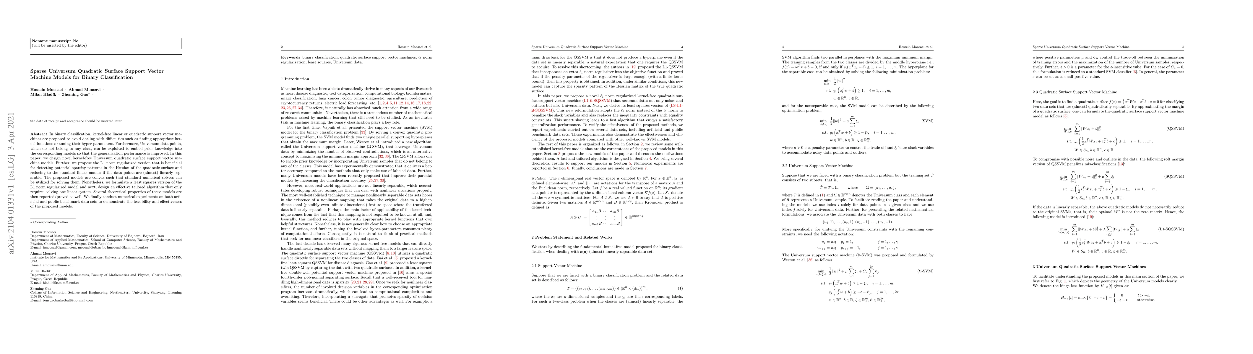 This paper proposes kernel-free quadratic surface support vector machine models for binary classification that utilize Universum data points to enhance generalization. The L1 norm regularized version detects sparsity and reduces to linear models for linearly separable data, and an efficient algorithm is developed for solving the models.