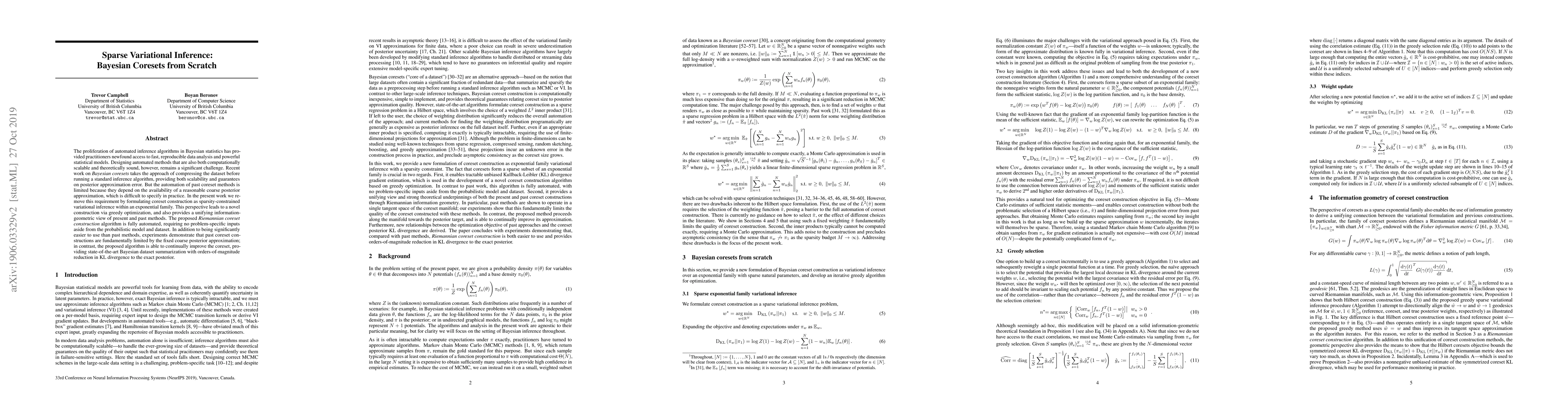 This paper presents a novel automated method for constructing Bayesian coresets through sparsity-constrained variational inference, eliminating the need for a predefined coarse posterior approximation. The proposed Riemannian coreset construction algorithm achieves state-of-the-art scalability and accuracy in Bayesian dataset summarization.