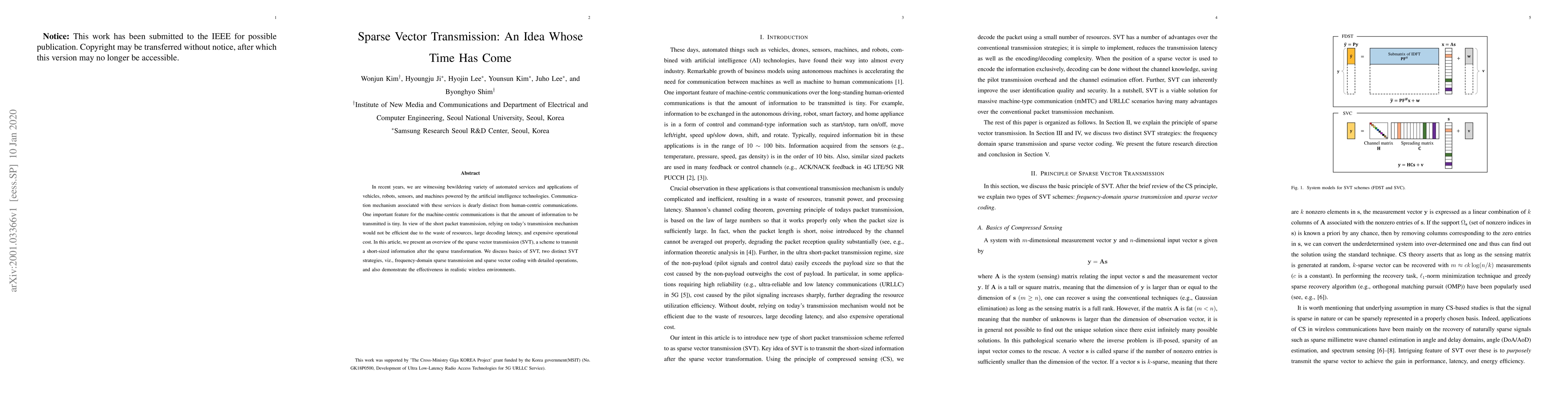 In recent years, we are witnessing bewildering variety of automated services and applications of vehicles, robots, sensors, and machines powered by the artificial intelligence technologies. Communication mechanism associated with these services is dearly distinct from human-centric communications. One important feature for the machine-centric communications is that the amount of information to be transmitted is tiny. In view of the short packet transmission, relying on today's transmission mechanism would not be efficient due to the waste of resources, large decoding latency, and expensive operational cost. In this article, we present an overview of the sparse vector transmission (SVT), a scheme to transmit a short-sized information after the sparse transformation. We discuss basics of SVT, two distinct SVT strategies, viz., frequency-domain sparse transmission and sparse vector coding with detailed operations, and also demonstrate the effectiveness in realistic wireless environments.