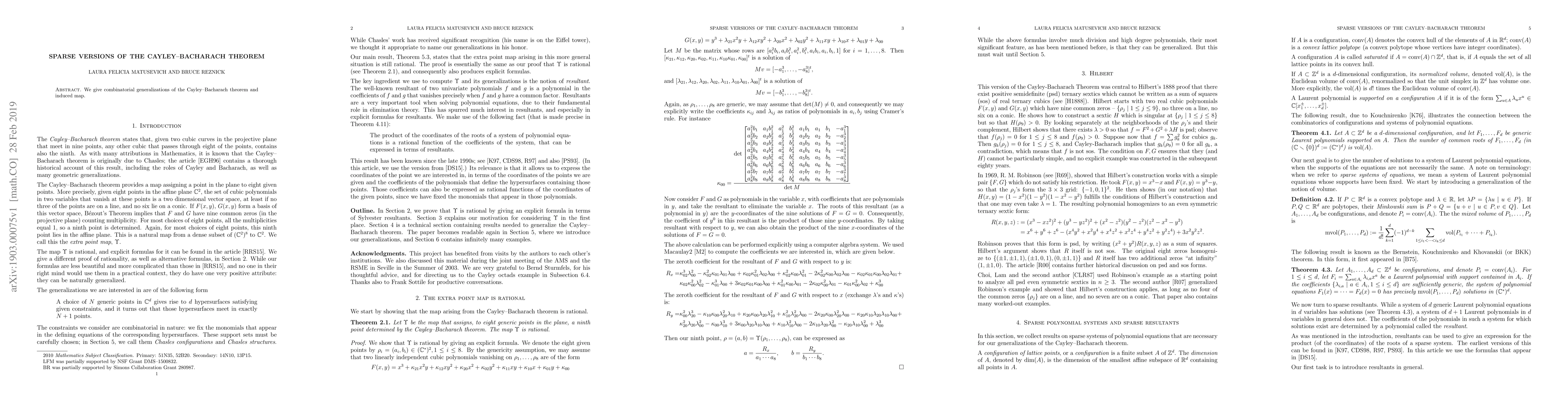 Summary: This paper presents combinatorial generalizations of the Cayley-Bacharach theorem, extending its principles to sparse versions and introducing an associated induced map.