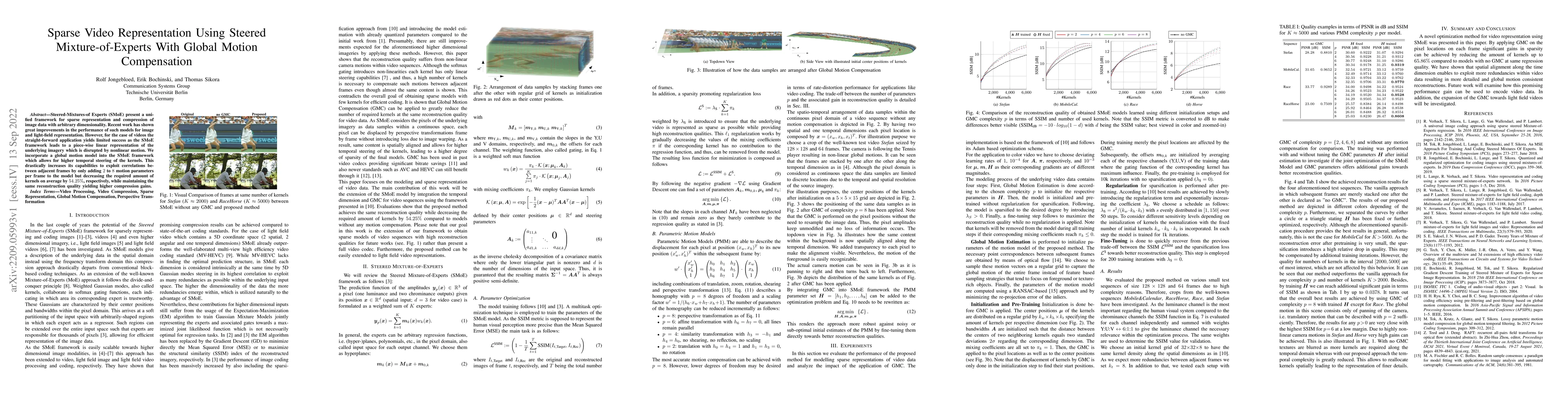 Steered-Mixtures-of Experts (SMoE) present a unified framework for sparse representation and compression of image data with arbitrary dimensionality. Recent work has shown great improvements in the performance of such models for image and light-field representation. However, for the case of videos the straight-forward application yields limited success as the SMoE framework leads to a piece-wise linear representation of the underlying imagery which is disrupted by nonlinear motion. We incorporate a global motion model into the SMoE framework which allows for higher temporal steering of the kernels. This drastically increases its capabilities to exploit correlations between adjacent frames by only adding 2 to 8 motion parameters per frame to the model but decreasing the required amount of kernels on average by 54.25%, respectively, while maintaining the same reconstruction quality yielding higher compression gains.